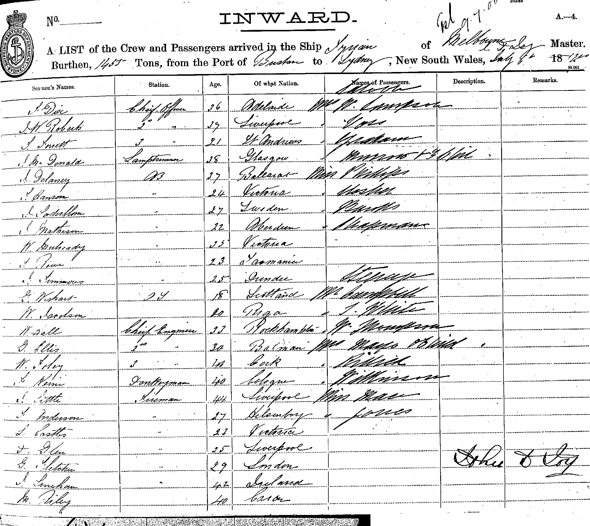 TYRIANOF MELBOURNE, J. D. JOY, MASTER, BURTHEN 1455 TONS FROM THE PORT OF BRISBANE TO SYDNEY, NEW SOUTH WALES, 6TH JULY 1900 |