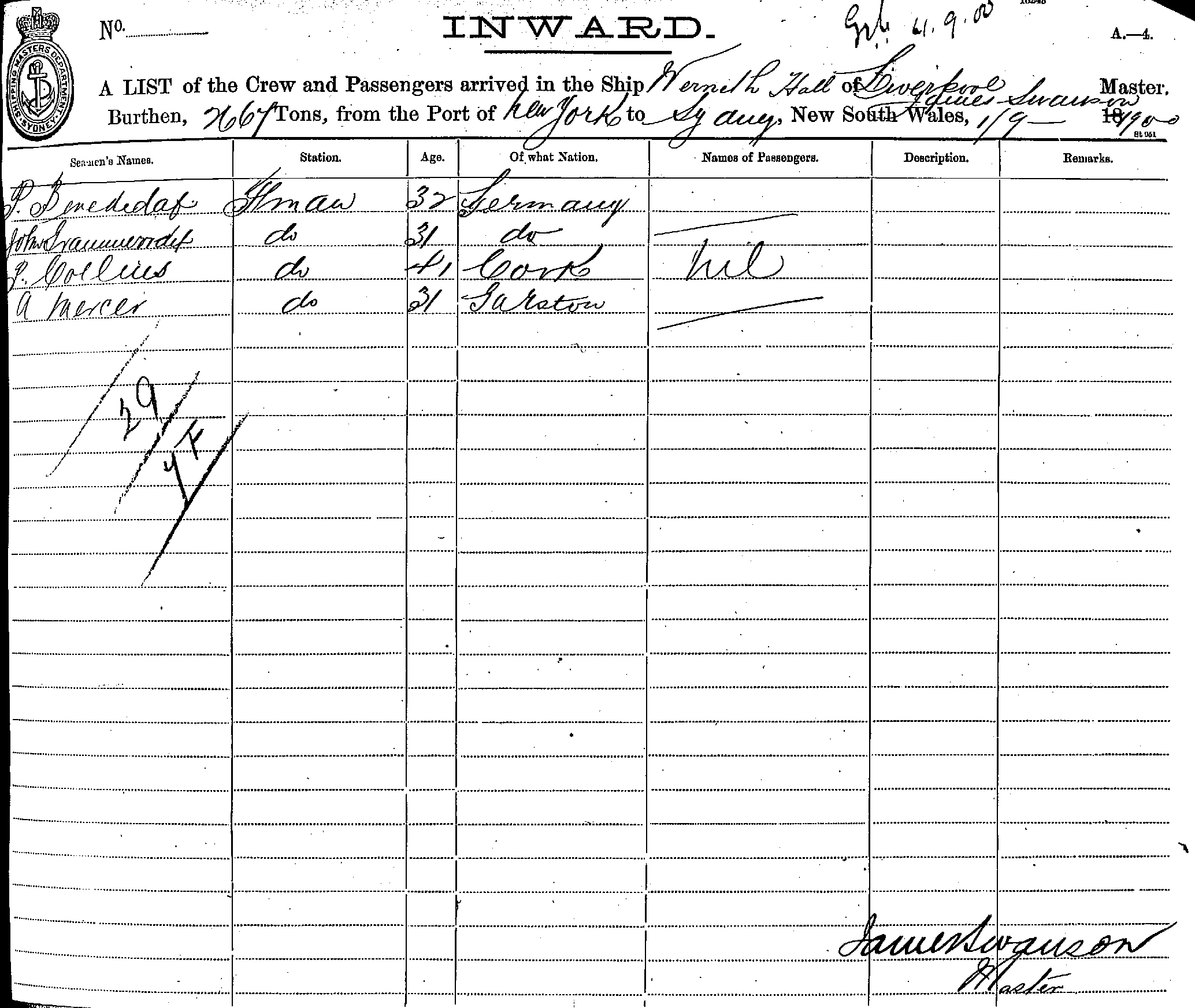 WERNETH HALLOF LIVERPOOL, JAMES SWANSON, MASTER, BURTHEN 2667 TONS FROM THE PORT OF NEW YORK VIA PORTS TO SYDNEY, NEW SOUTH WALES, 1ST SEPTEMBER 1900 |