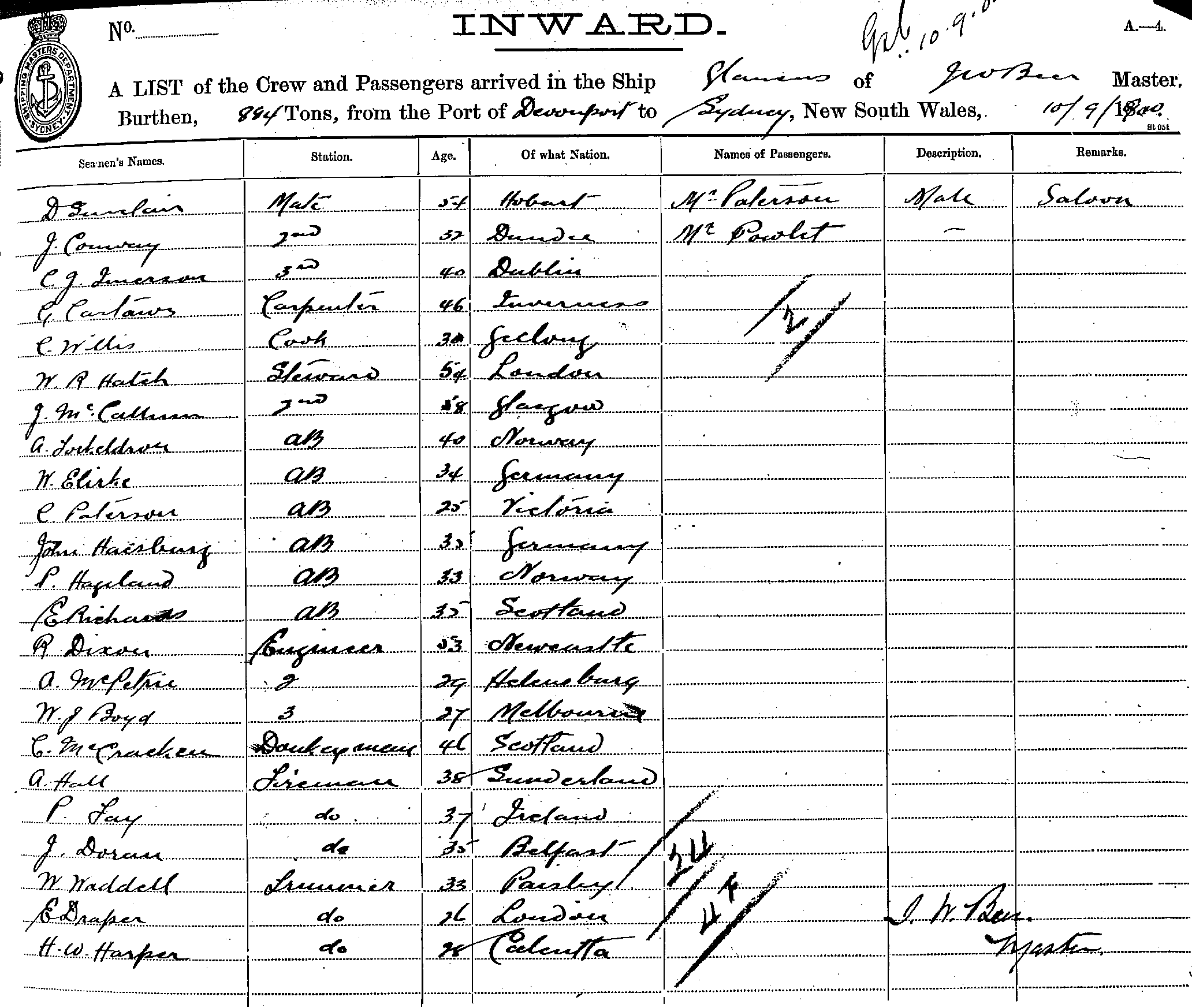 GLAMENSOF ?, J. W. BEER, MASTER, BURTHEN 884 TONS FROM THE PORT OF DEVONPORT TO SYDNEY, NEW SOUTH WALES, 10TH SEPTEMBER 1900 |
