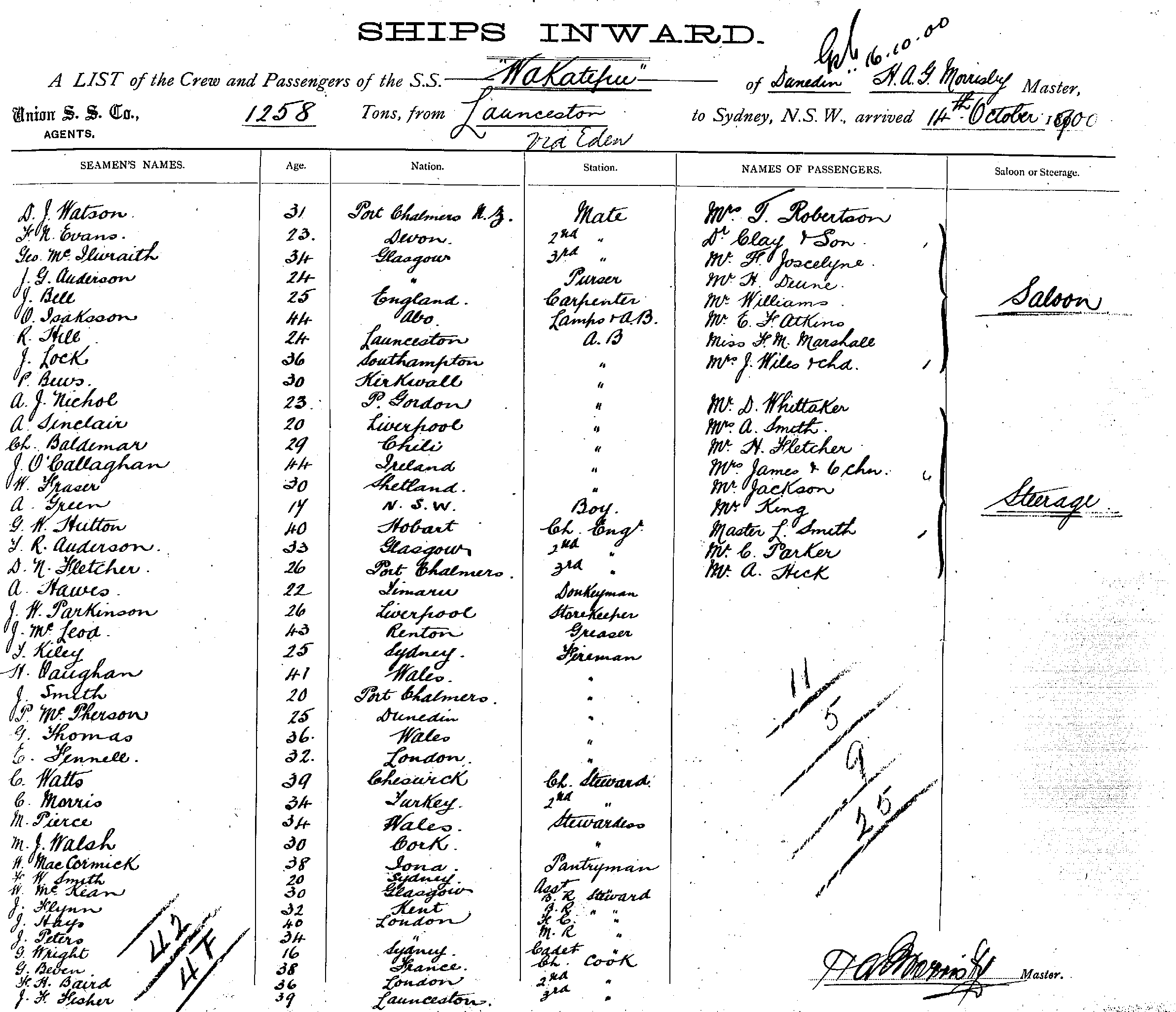 WAKATIPUOF DUNEDIN, H. A. G. MORRISBY, MASTER, BURTHEN 1258 TONS FROM THE PORT OFLAUNCESTON VIA EDEN TO SYDNEY, NEW SOUTH WALES, 14TH OCTOBER 1900 |