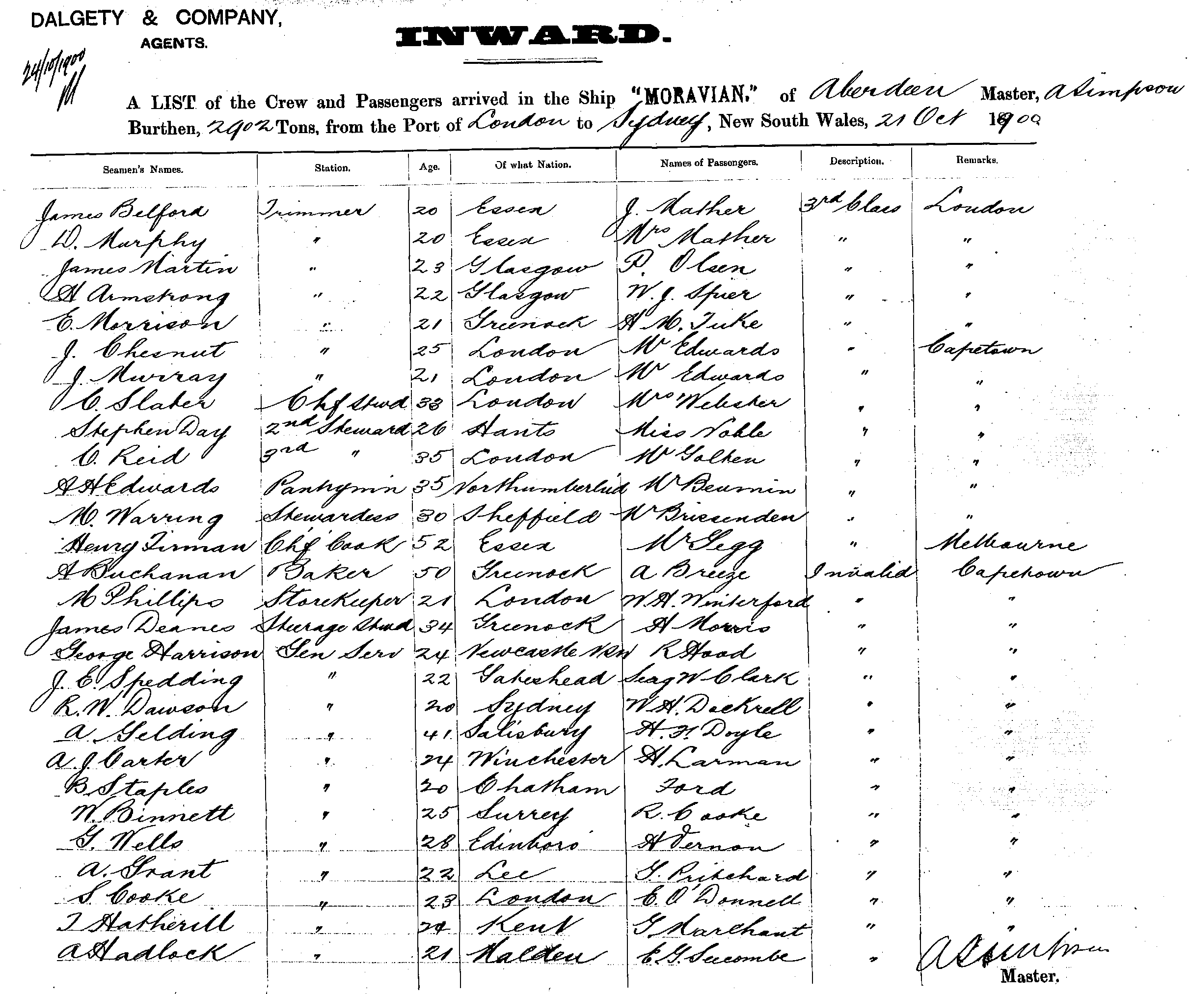 MORAVIANOF ABERDEEN, A. SIMPSON, MASTER, BURTHEN 2902 TONS FROM THE PORT OF LONDON VIA PORTS TO SYDNEY, NEW SOUTH WALES, 21ST OCTOBER 1900 |