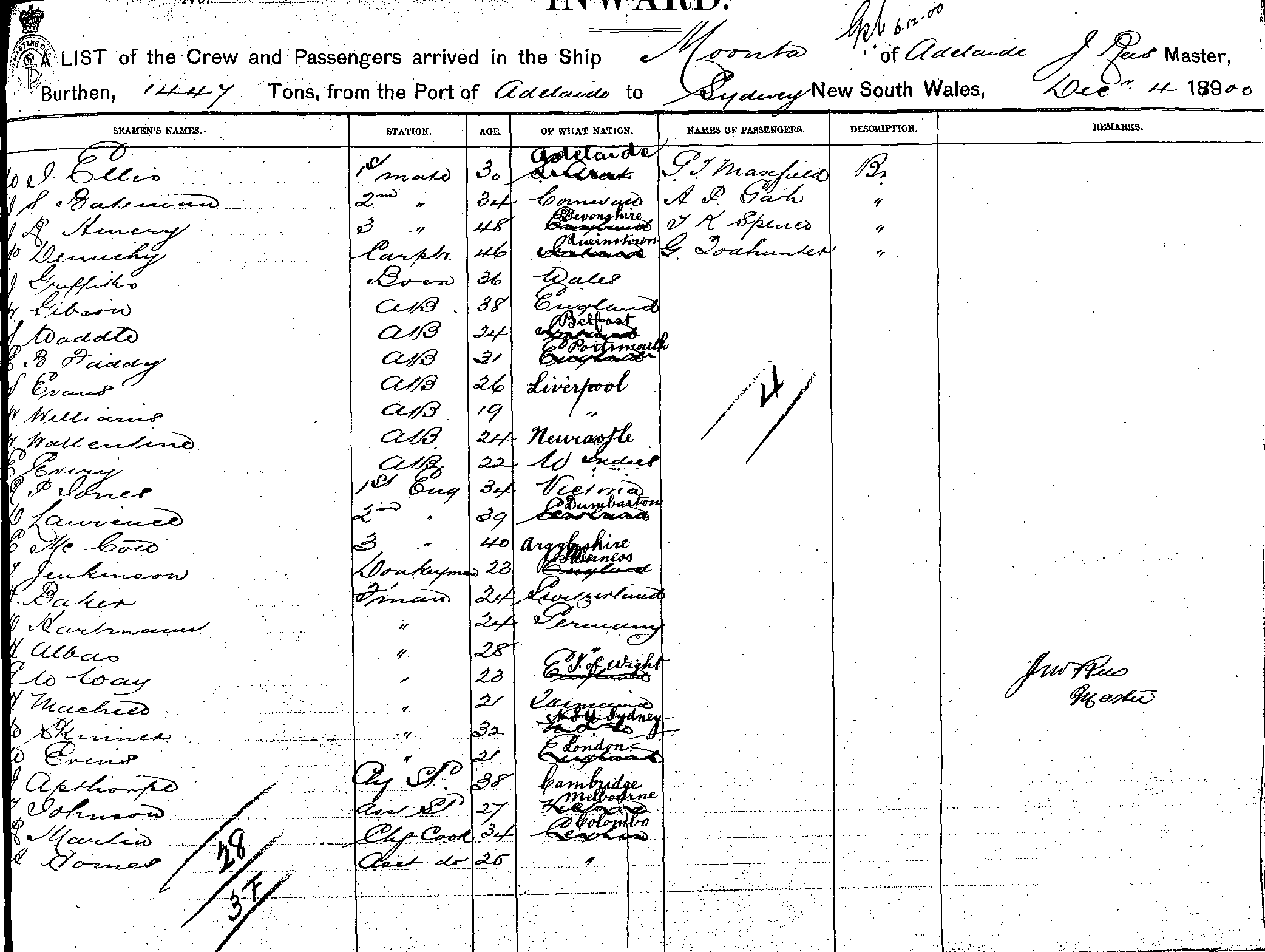 MOONTAOF ADELAIDE, J. REES. MASTER, BURTHEN 1447 TONS FROM THE PORT OF ADELAIDE TO SYDNEY, NEW SOUTH WALES. 4TH DECEMBER 1900 |