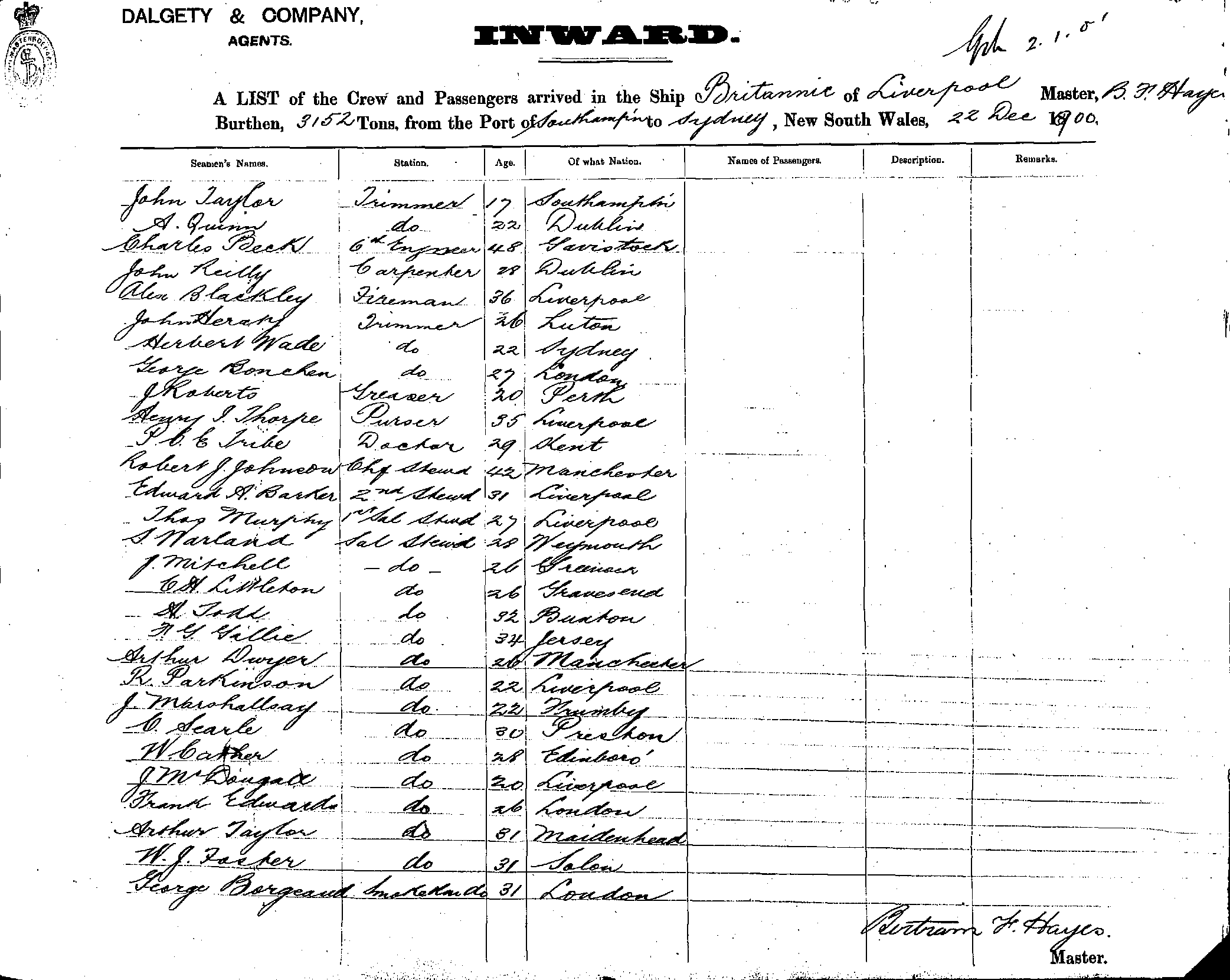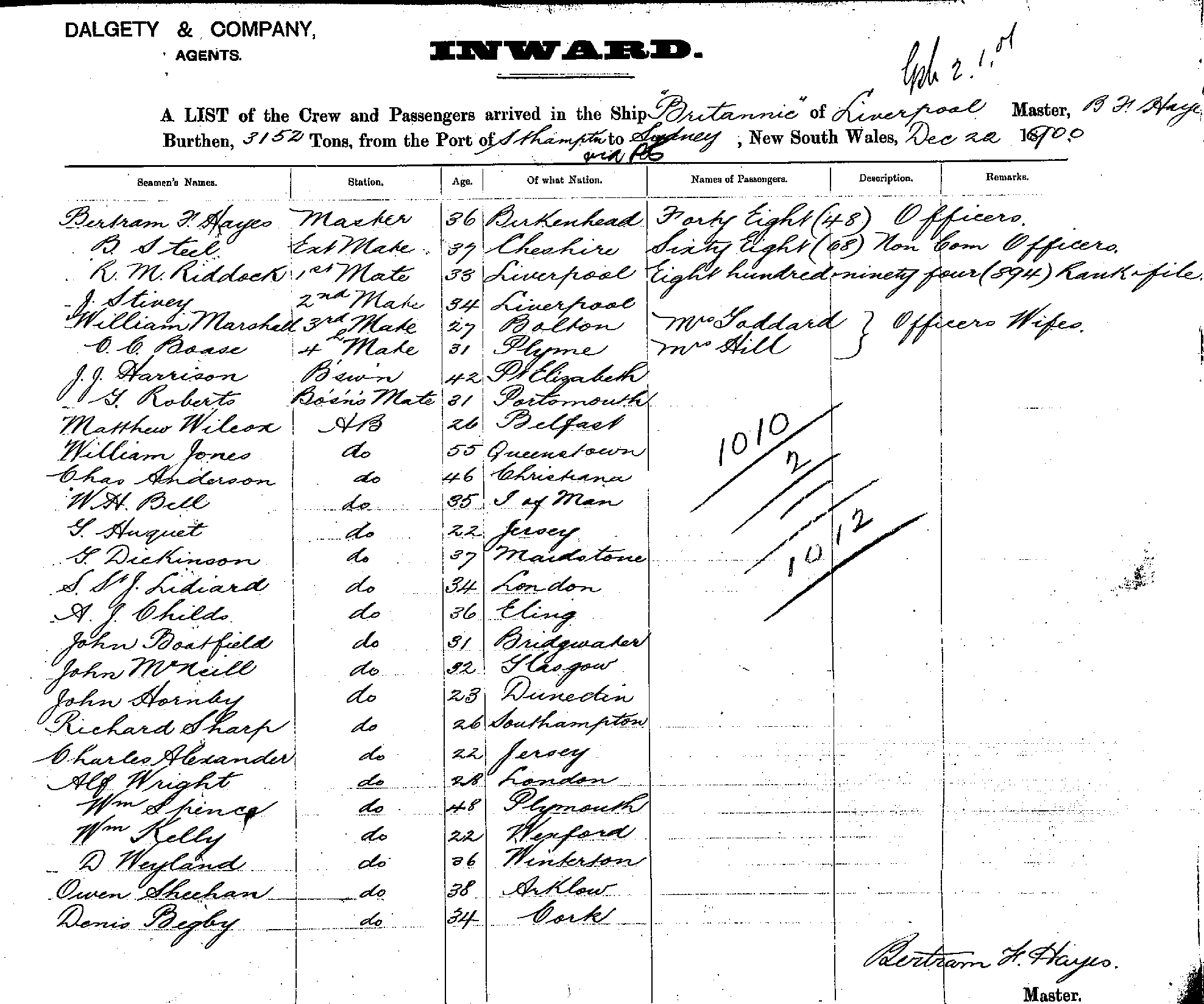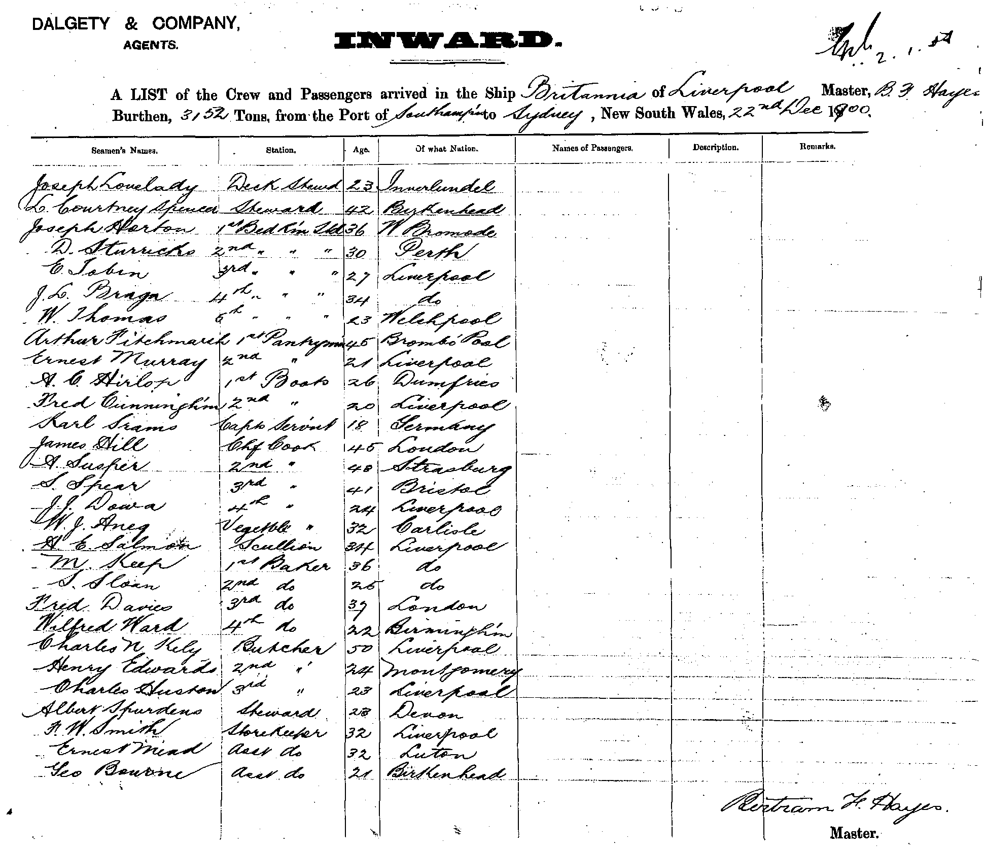 BRITANNICOF LIVERPOOL, BERTRAM F. HAYES, MASTER, BURTHEN 3152 TONS FROM THE PORT OF SOUTHAMPTON VIA PORTS TO SYDNEY, NEW SOUTH WALES, 22ND DECEMBER 1900 |