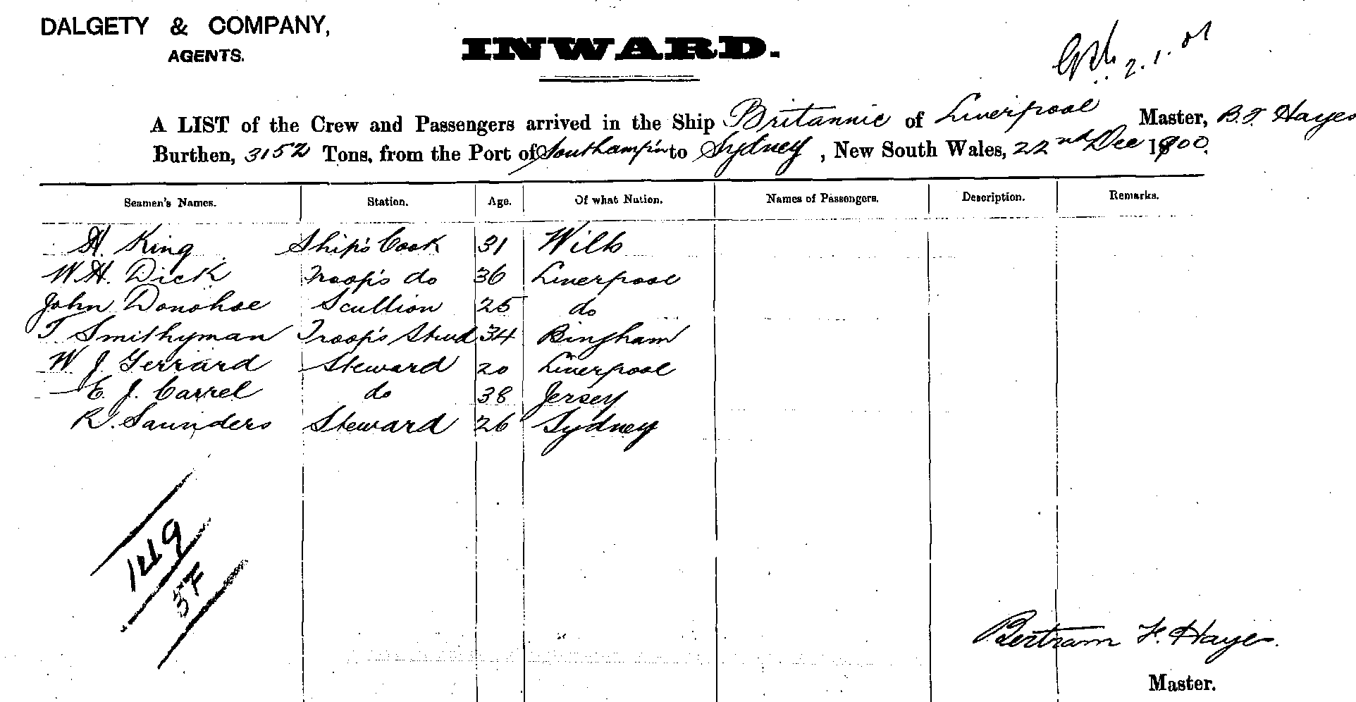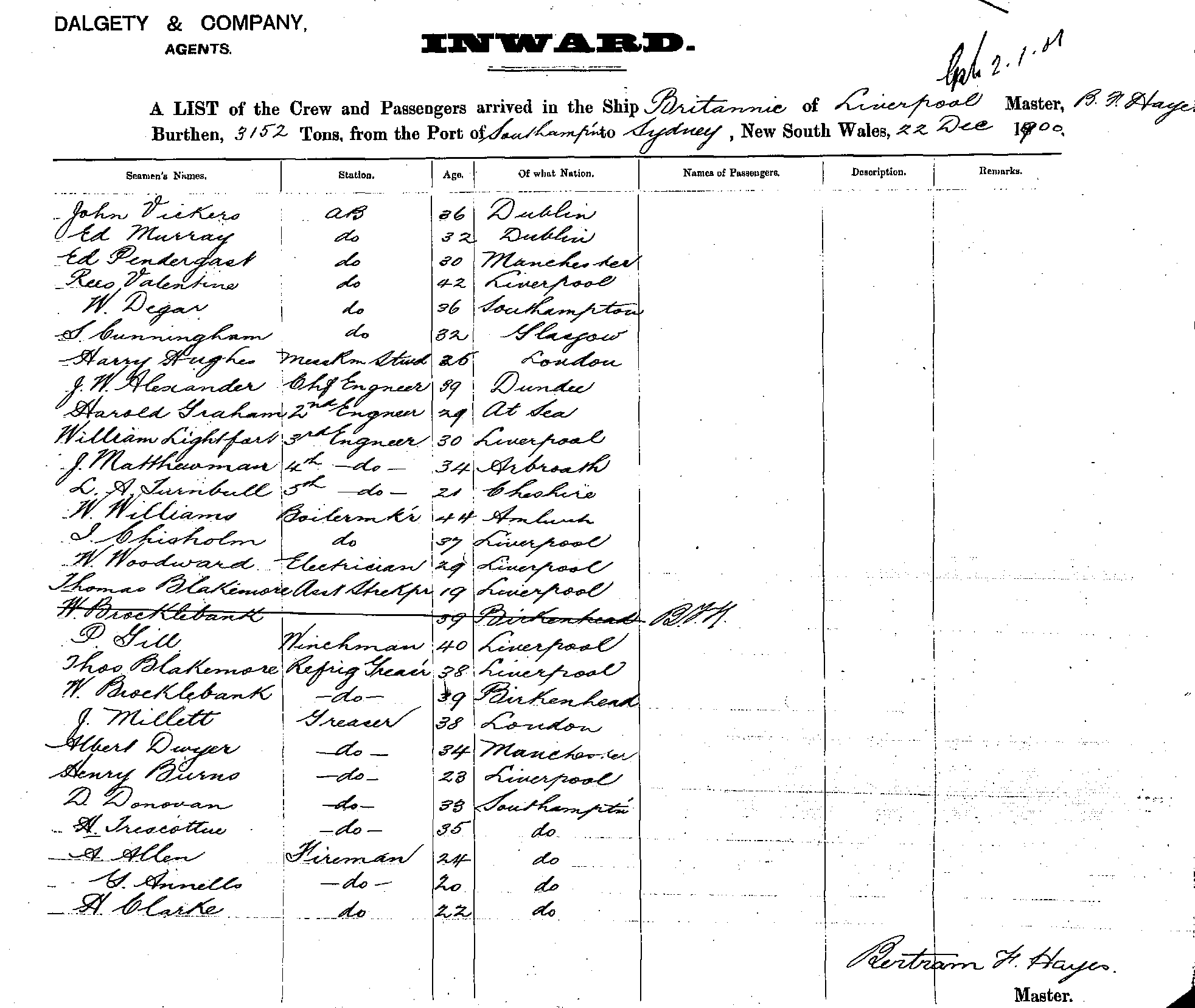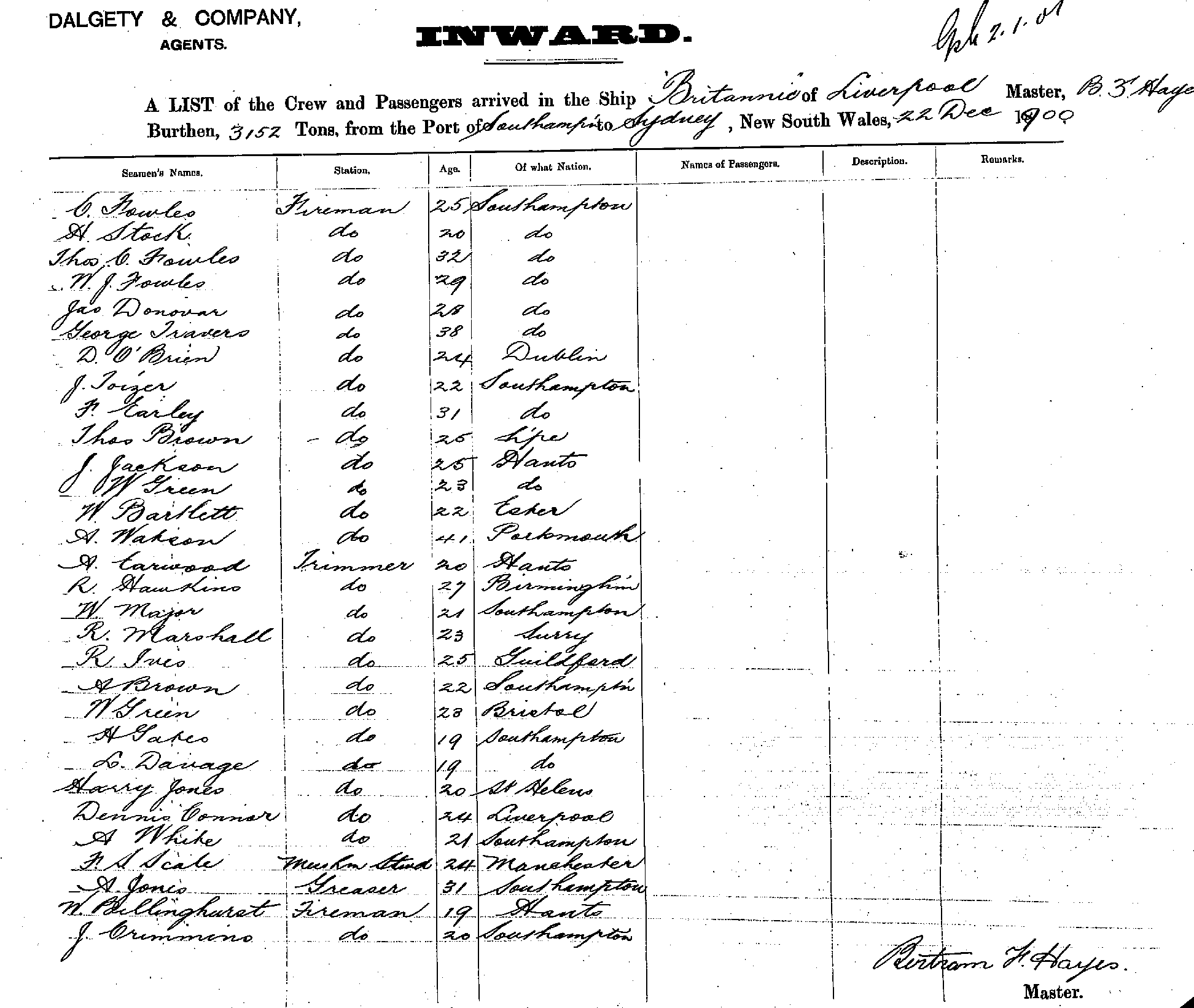 BRITANNICOF LIVERPOOL, BERTRAM F. HAYES, MASTER, BURTHEN 3152 TONS FROM THE PORT OF SOUTHAMPTON VIA PORTS TO SYDNEY, NEW SOUTH WALES, 22ND DECEMBER 1900 |
