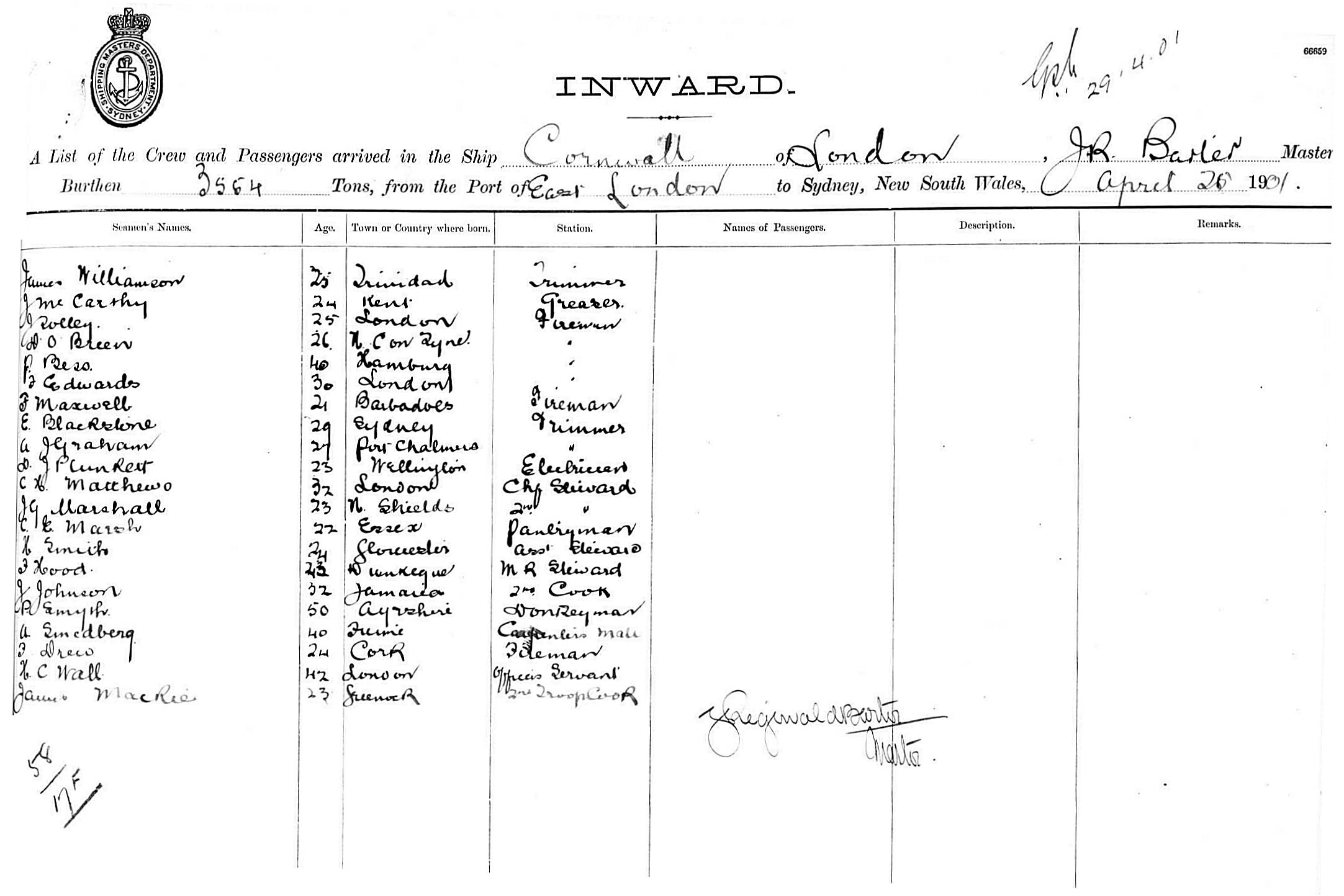 CORNWALLOF LONDON, J. R. BARTER, MASTER, BURTHEN 3554 TONS FROM THE PORT OF EAST LONDON TO SYDNEY, NEW SOUTH WALES, 25TH APRIL 1901 |