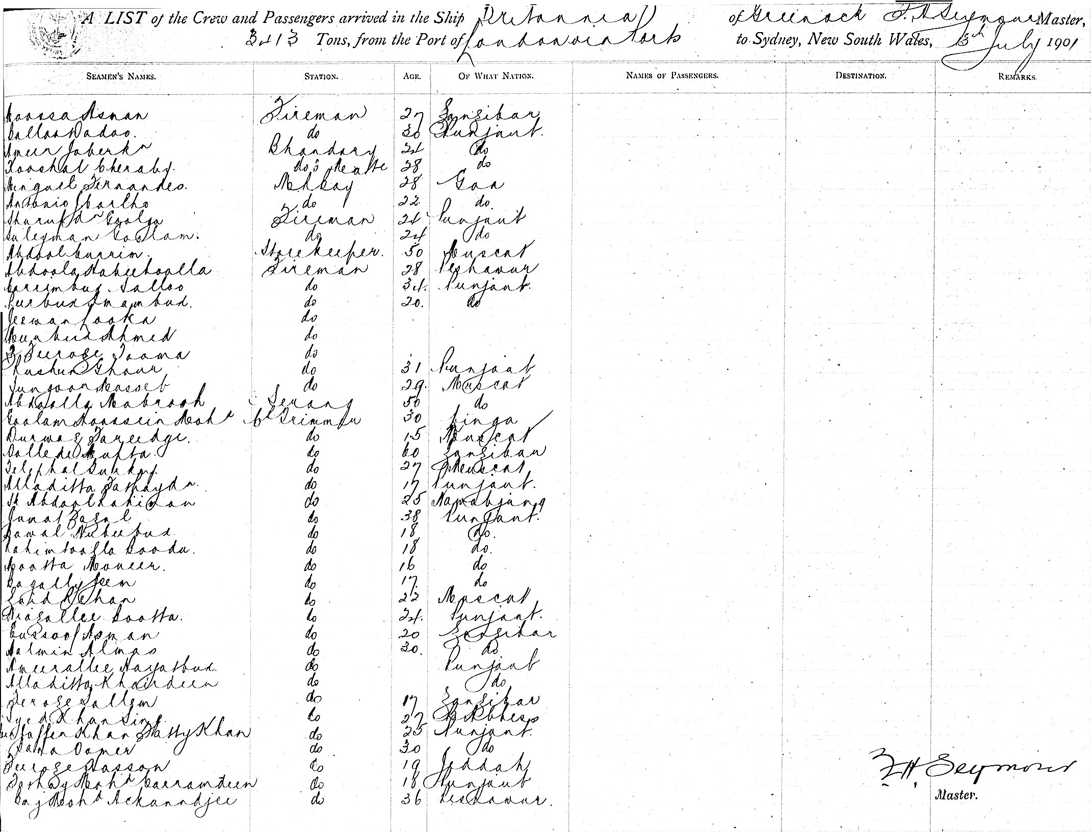 BRITANNIAOF GREENOCK. F. H. SEYMOUR, MASTER, BURTHEN 3413 TONS FROM PORT OF LONDON VIA PORTS TO SYDNEY, NEW SOUTH WALES, 15TH JULY 1901 |