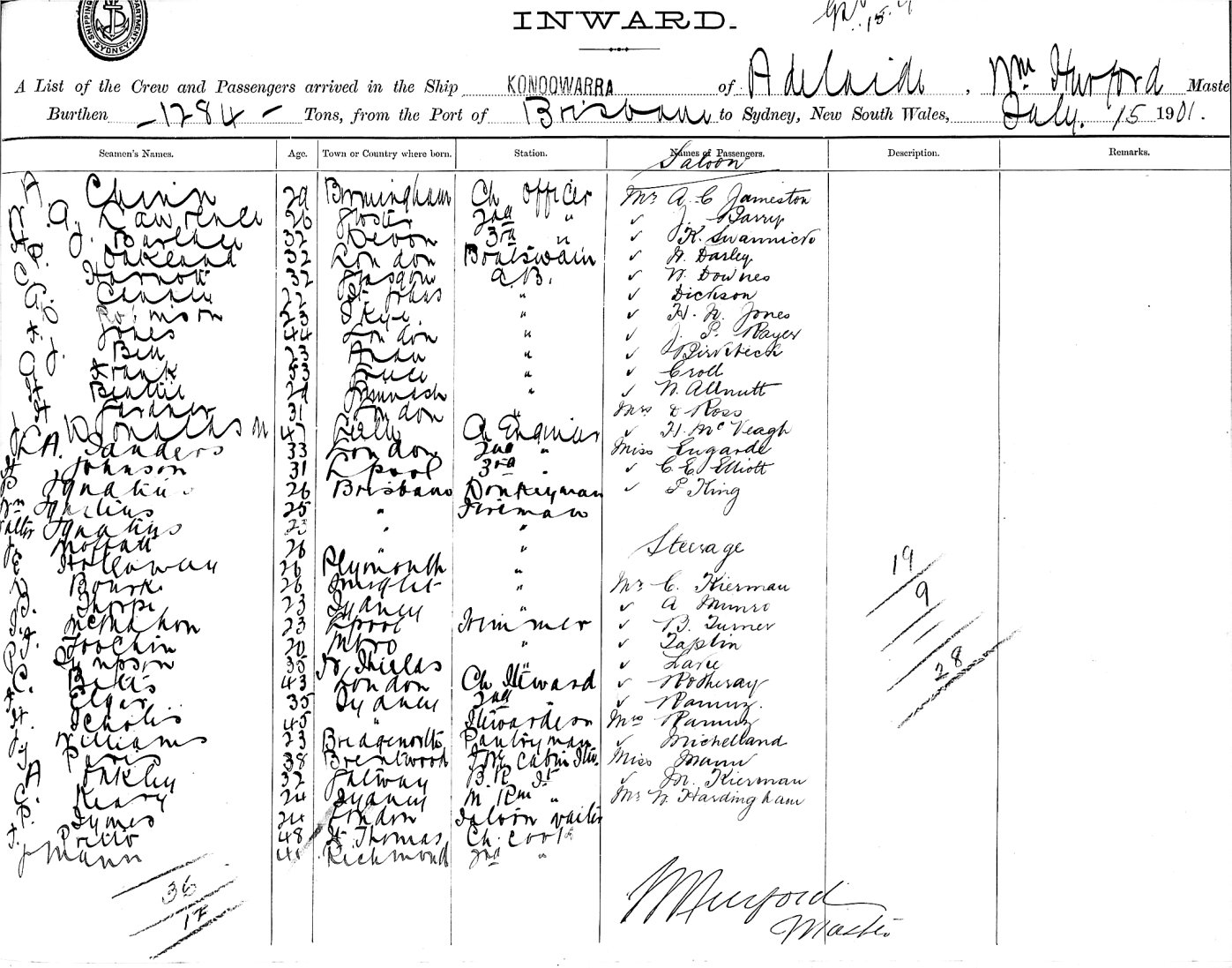 KONOOWARRAOF ADELAIDE. WM. HURFORD, MASTER, BURTHEN 1284 TONS FROM PORT OF BRISBANE TO SYDNEY, NEW SOUTH WALES, 15TH JULY 1901 |