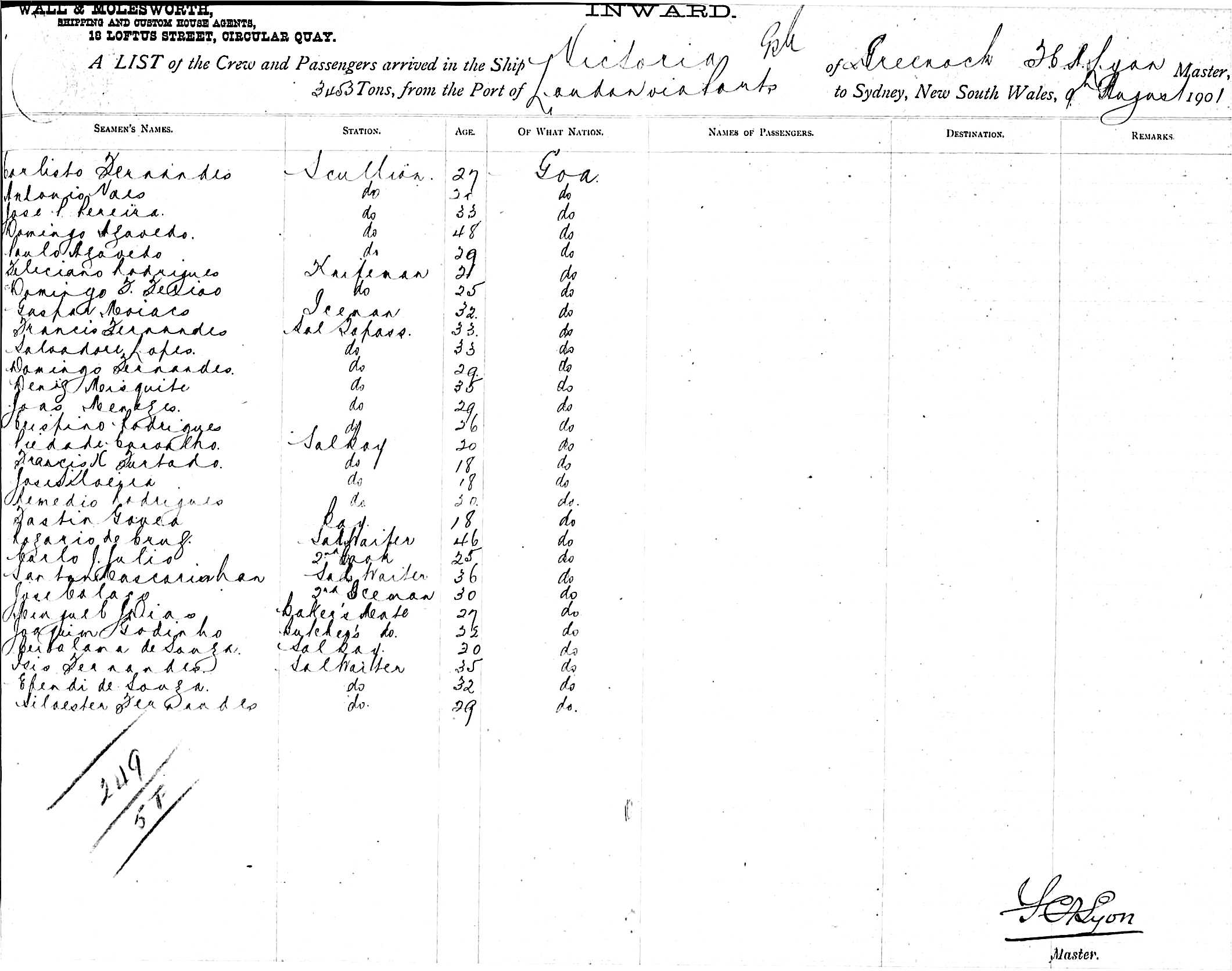 VICTORIAOF GREENOCK. F. C. A. LYON, MASTER, BURTHEN 3453 TONS FROM PORT OF LONDON VIA PORTS TO SYDNEY, NEW SOUTH WALES, 9TH AUGUST 1901 |