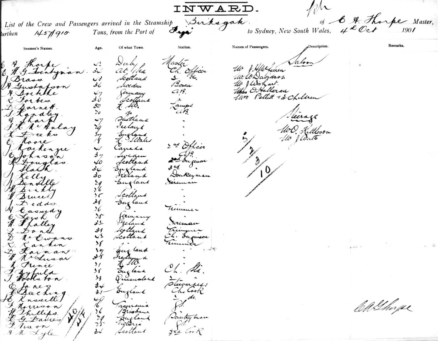 BIRKSGATEOF ?, C. A. THORPE, MASTER, BURTHEN 1457/915 TONS FROM PORT OF FIJI TO SYDNEY, NEW SOUTH WALES. 4TH OCTOBER 1901 |