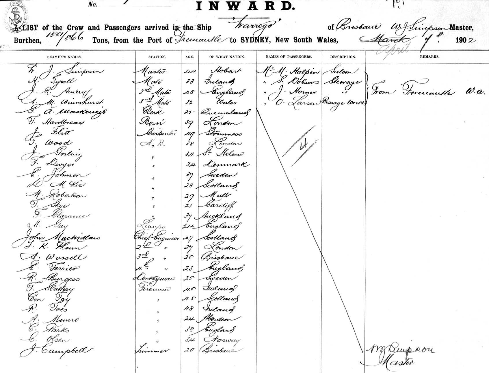 WARREGOOF BRISBANE, W. J. SIMPSON, MASTER, BURTHEN 1551 / 866 TONS FROM THE PORT OF FREMANTLE TO SYDNEY, NEW SOUTH WALES, 7TH APRIL, 1902 |