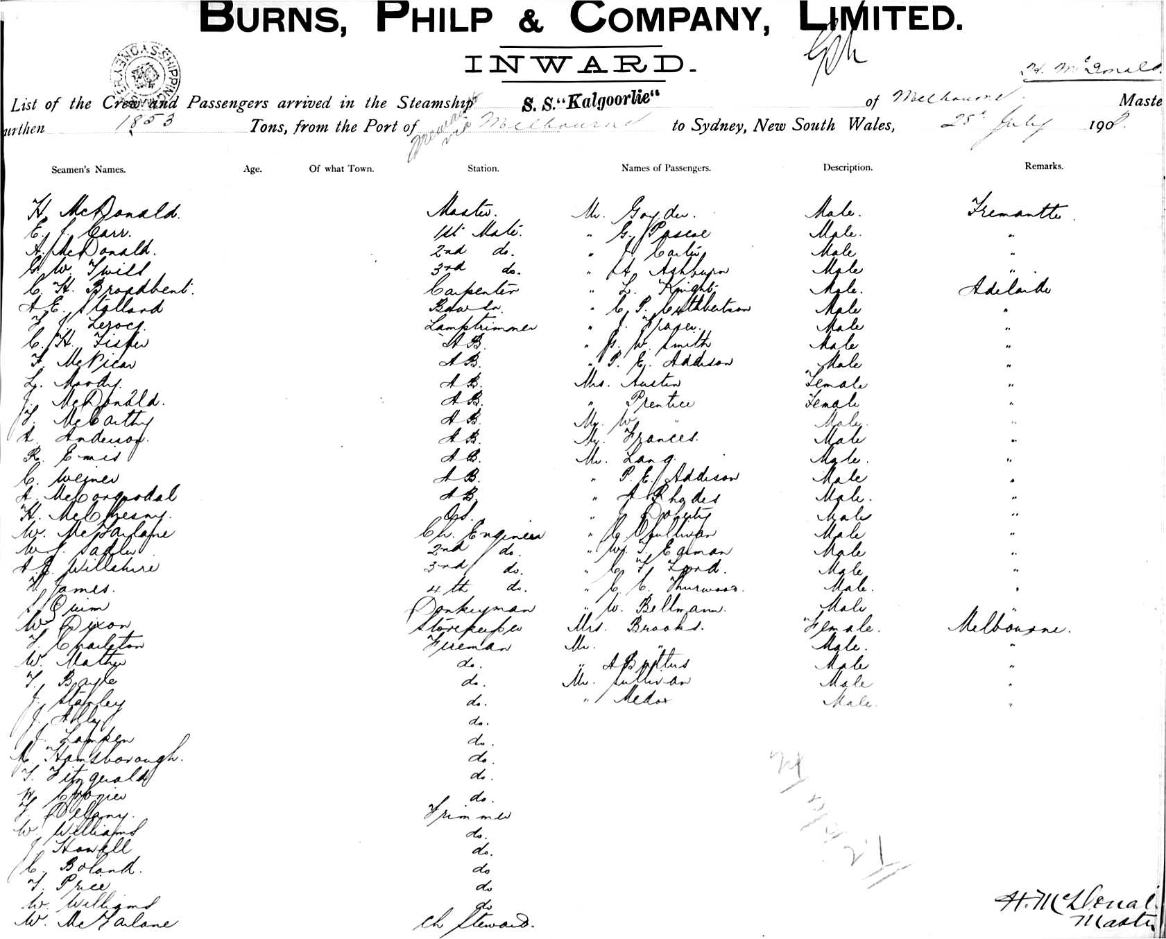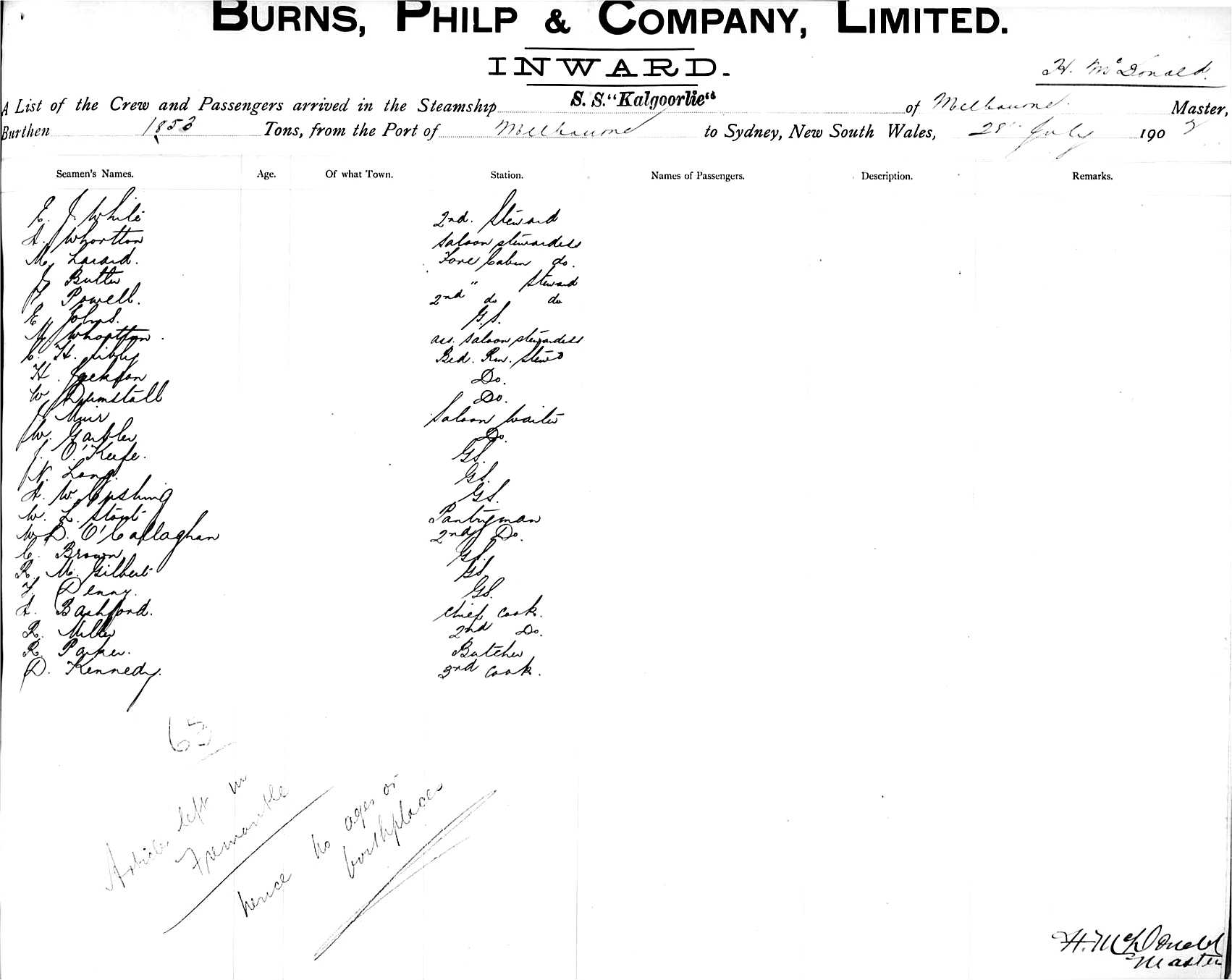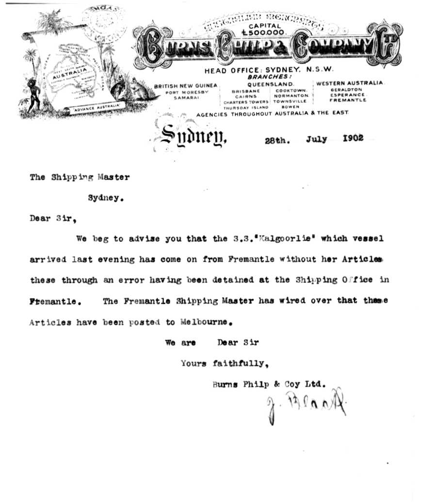 KALGOORLIEOF MELBOURNE, H. MCDONALD, MASTER, BURTHEN 1853 TONS FROM THE PORT OF FREMANTLE VIA MELBOURNE TO SYDNEY, NEW SOUTH WALES, 28TH JULY, 1902 |