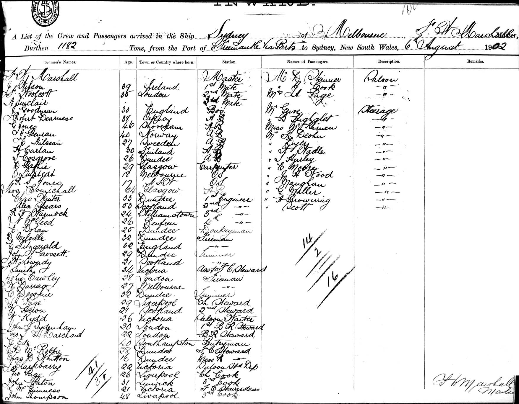 SYDNEYOF MELBOURNE, F W MARSHALL, MASTER, BURTHEN 1182 TONS FROM THE PORT OF FREEMANTLE VIA PORTS TO SYDNEY, NEW SOUTH WALES, 6 AUGUST, 1902 |