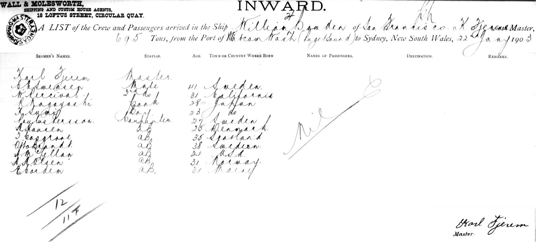 WILLIAM H BOWDENOF SAN FRANCISCO, K. FJEREM, MASTER, BURTHEN 598 TONS FROM THE PORT OF WHATCOM WASH. PUJET SOUND TO SYDNEY, NEW SOUTH WALES 22ND JANUARY 1903 |