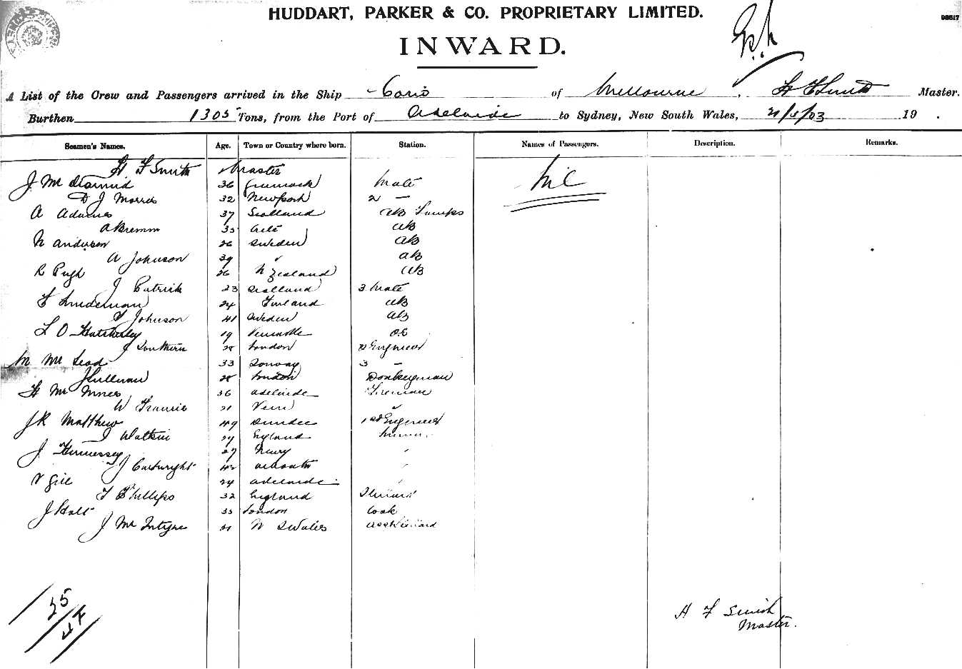 CORIOOF MELBOURNE, H.F. SMITH, MASTER, BURTHEN 1305 TONS FROM THE PORT OF ADELAIDE TO SYDNEY, NEW SOUTH WALES, 21ST MAY 1903 |