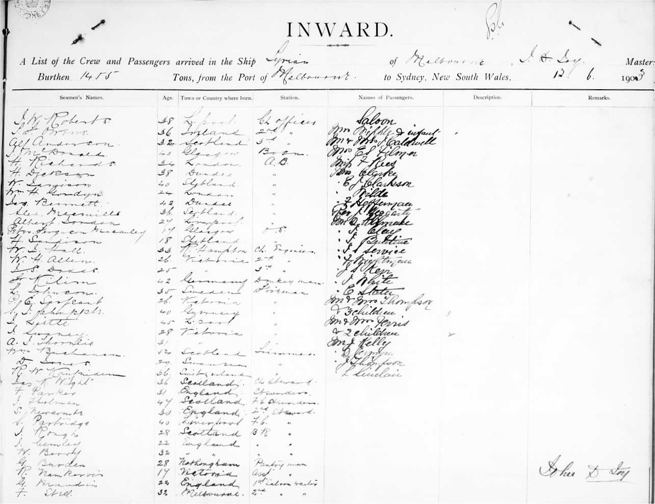 TYRIANOF MELBOURNE, JOHN D. JOY, MASTER, BURTHEN 1455 TONS FROM THE PORT OF MELBOURNE TO SYDNEY, NEW SOUTH WALES, 12TH JUNE 1903 |