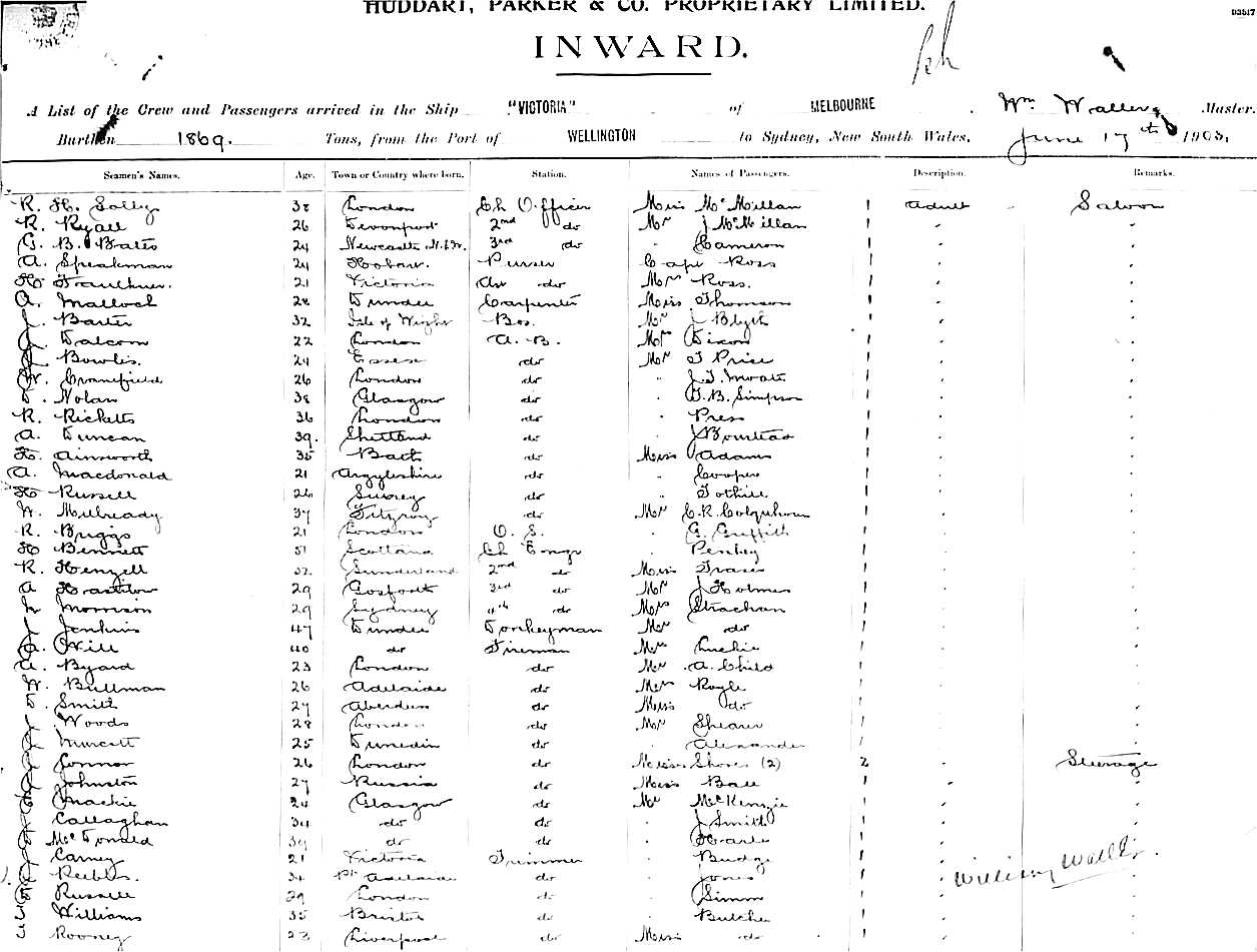 VICTORIAOF MELBOURNE, W. WALLER, MASTER, BURTHEN 1869 TONS FROM THE PORT OF WELLINGTON TO SYDNEY, NEW SOUTH WALES, 17TH JUNE 1903 |