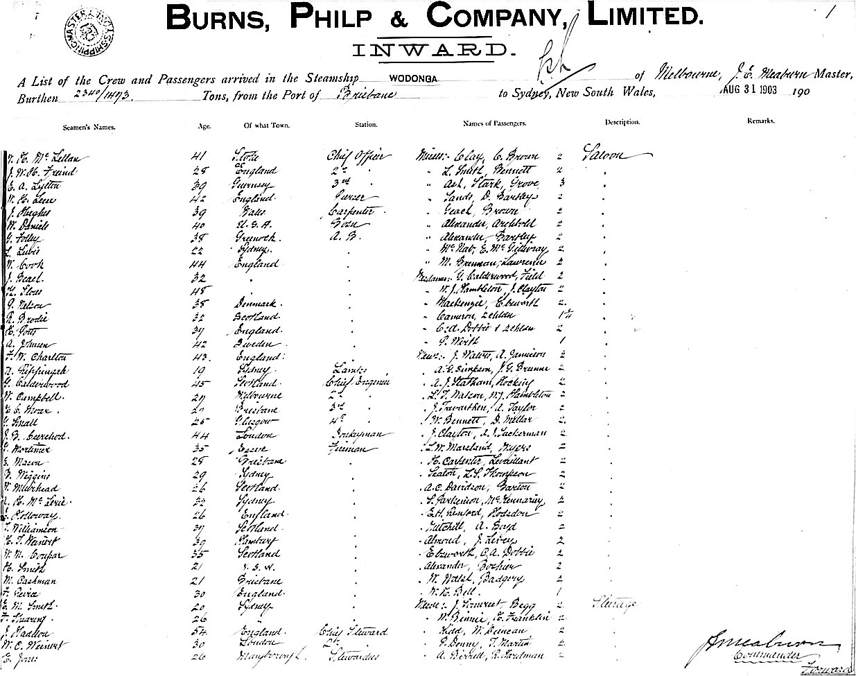 WODONGAOFMELBOURNE, J. E. MEABURN, MASTER, BURTHEN 2340 TONS FROM THE PORT OF BRISBANE TO SYDNEY, NEW SOUTH WALES, 31 AUGUST, 1903 |