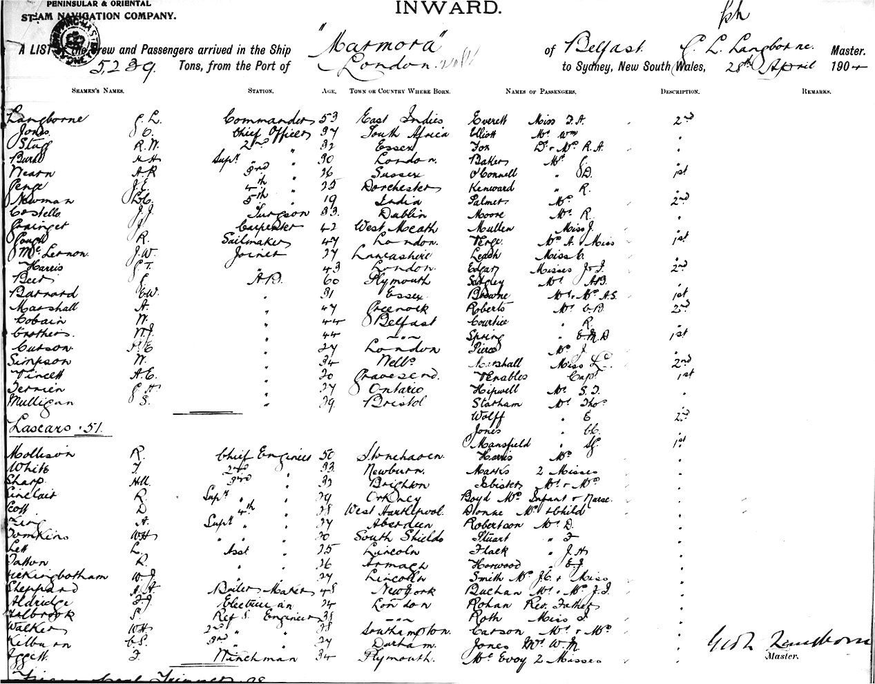 Source: State Records Authority of New South Wales: Shipping Master's Office; Passengers Arriving 1855 - 1922; NRS13278, [X289] reel 2017 / 2018. Transcribed by Alec Goulding. Proofread by Lyn & Maurie.