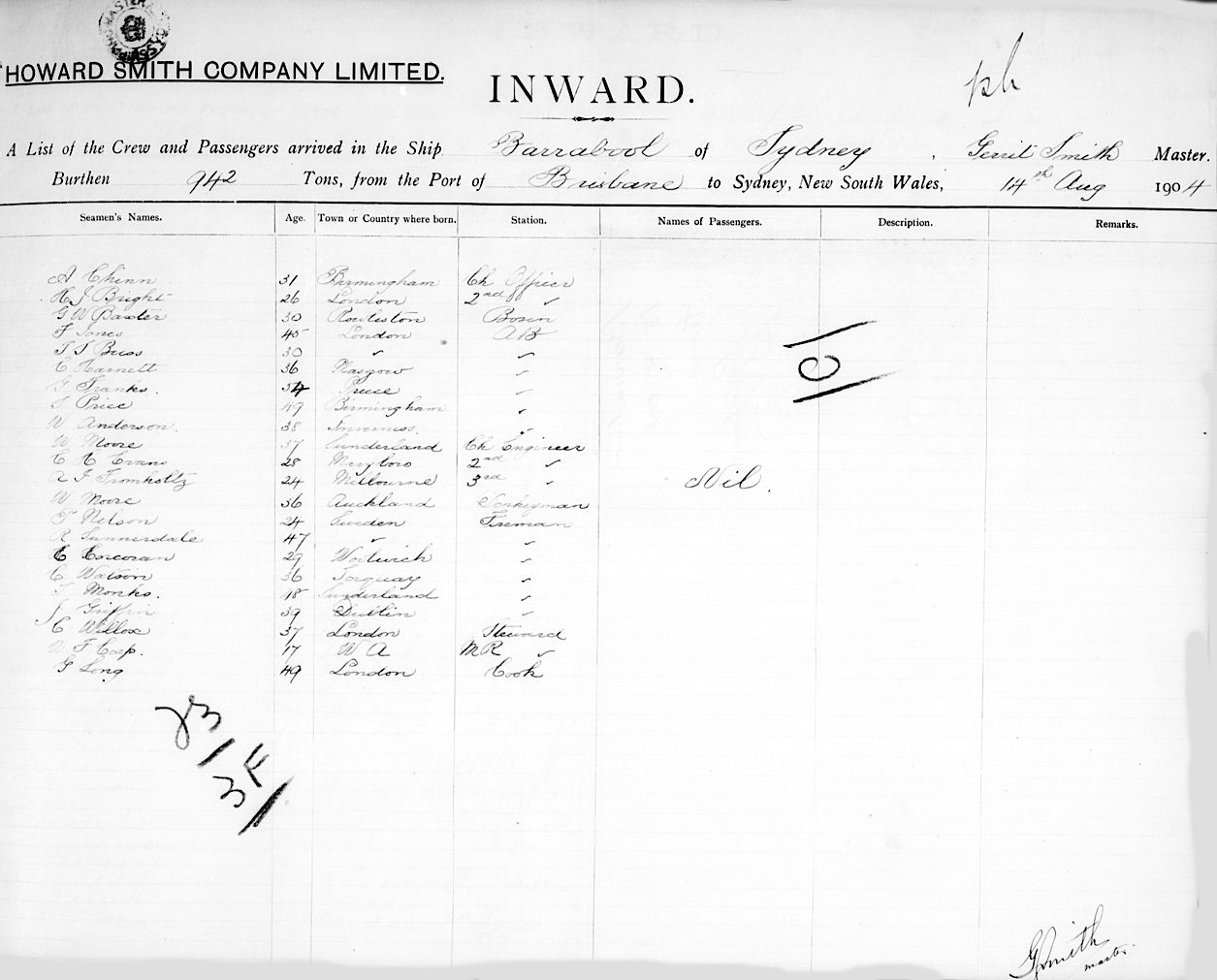 BARRABOOLOF SYDNEY, GERRIT SMITH, MASTER, BURTHEN 942 TONS FROM THE PORT OF BRISBANE TO SYDNEY, NEW SOUTH WALES, 14TH AUGUST 1904 |