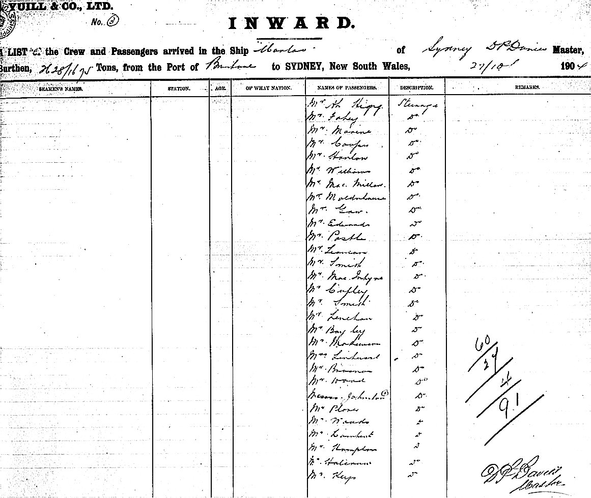 Source: State Records Authority of New South Wales: Shipping Master's Office; Passengers Arriving 1855 - 1922; NRS13278, [X2019- X2020] reel 292. Transcribed by Dorothy D'Arcy. Proofread by Lyn & Maurie. You may view/print a scan of the original list - a monitor set to high resolution is recommended for clarity. Use your back button to return. |