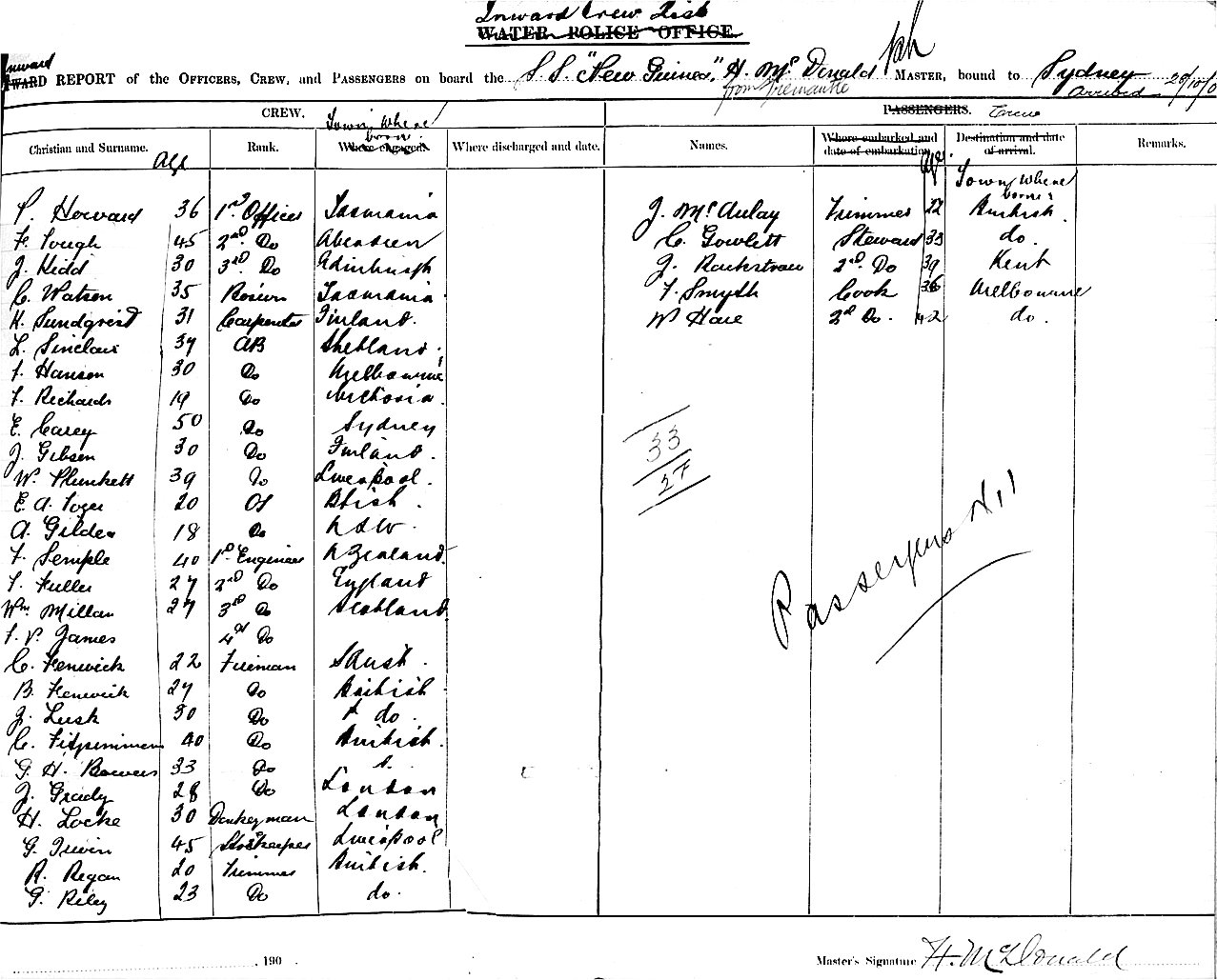 NEW GUINEAOF MELBOURNE, H. MC DCONALD, MASTER, BURTHEN 2673 TONS FROM THE PORT OF FREMANTLE TO SYDNEY, NEW SOUTH WALES, 28TH OCTOBER 1904 |