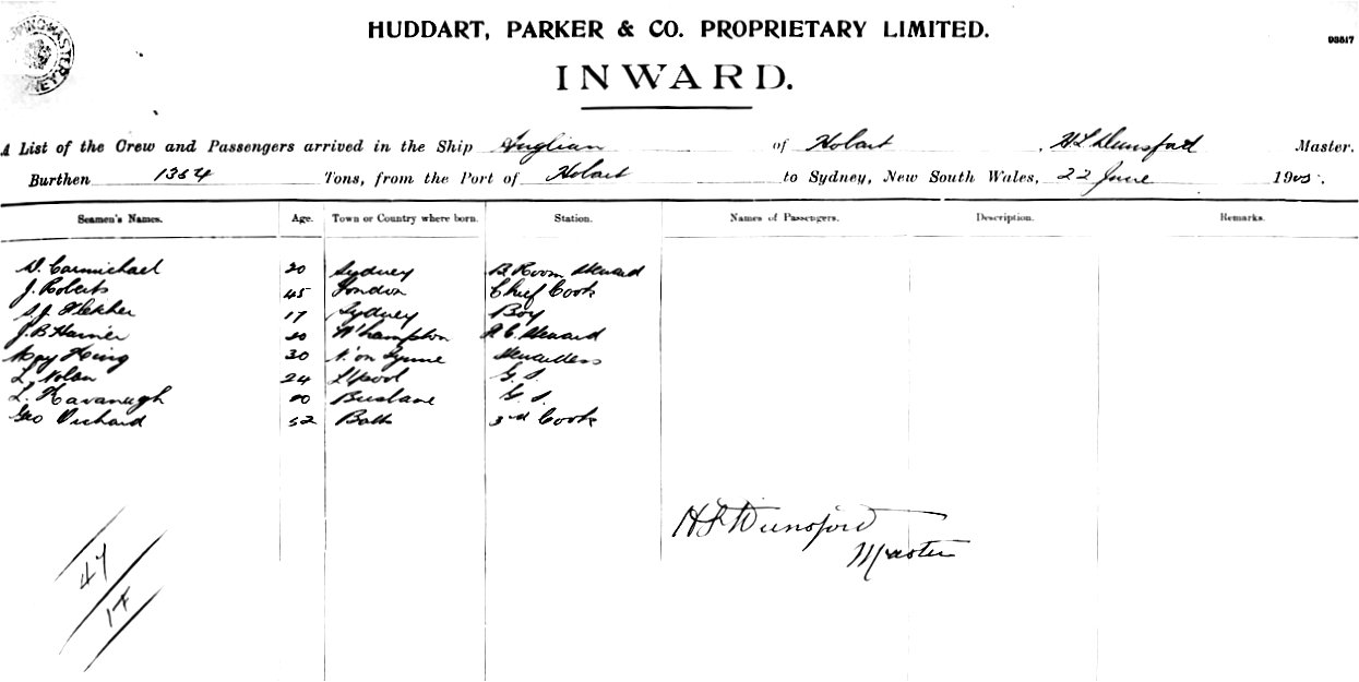 ANGLIANOF HOBART, H. L. DUNSFORD, MASTER, BURTHEN 1352 TONS FROM THE PORT OF HOBART TO SYDNEY, NEW SOUTH WALES, 22ND JUNE 1905 |