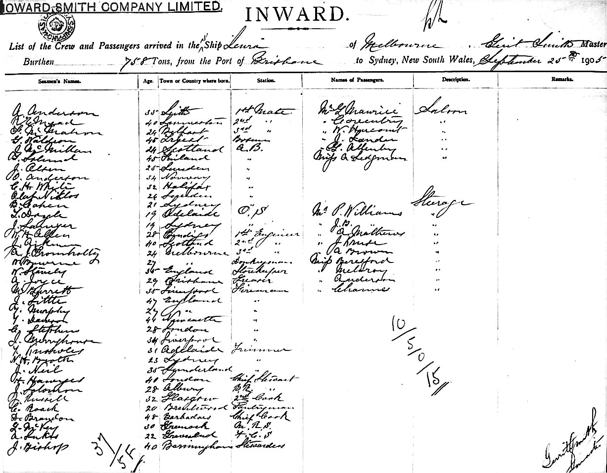 LEURAOF MELBOURNE, GERRIT SMITH, MASTER, BURTHEN 758 TONS FROM THE PORT OF BRISBANE TO SYDNEY, NEW SOUTH WALES, 25TH SEPTEMBER 1905 |