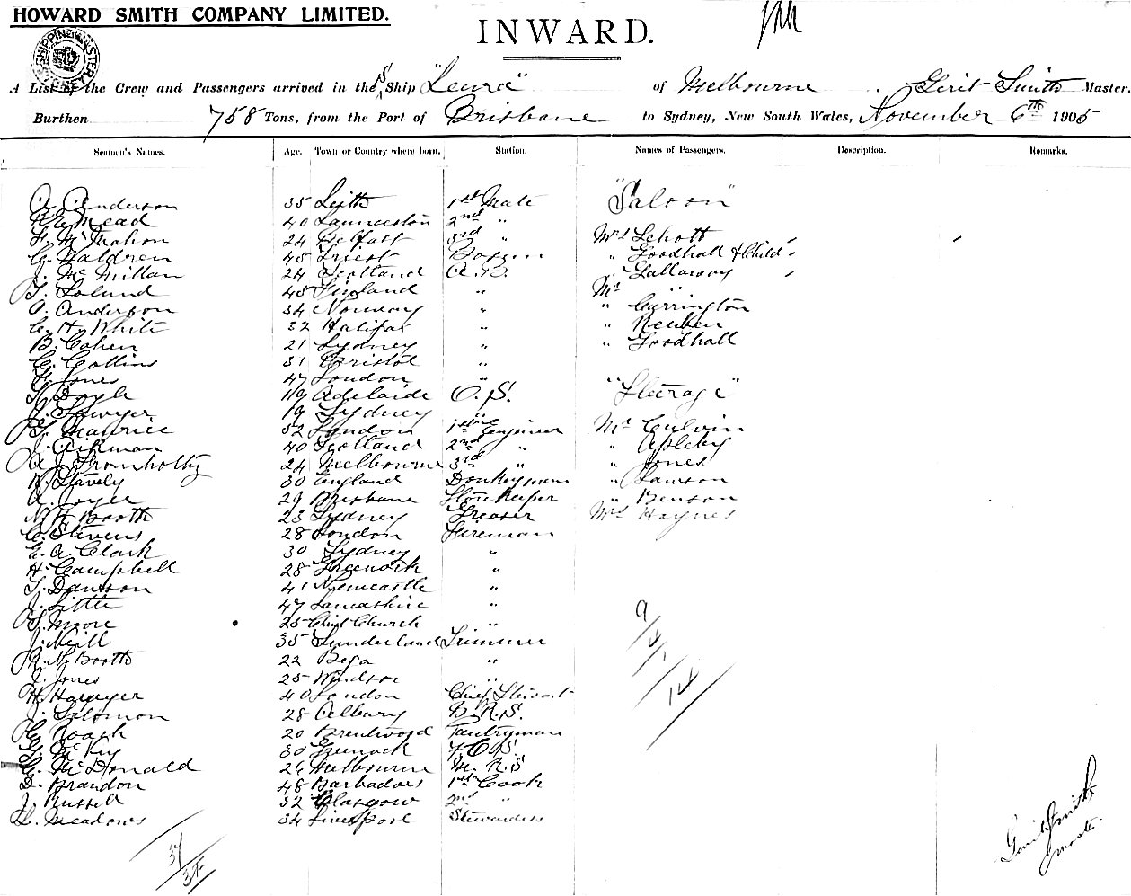 LEURAOF MELBOURNE, GERRIT SMITH, MASTER, BURTHEN 758 TONS FROM THE PORT OF BRISBANE TO SYDNEY, NEW SOUTH WALES, 6TH NOVEMBER, 1905 |
