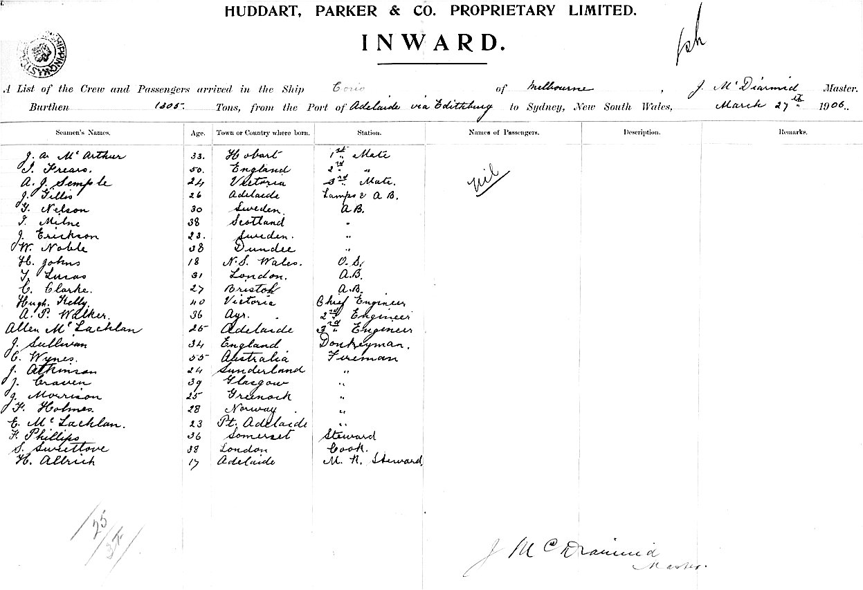 CORIOOF MELBOURNE, J MCDIARMID, MASTER, BURTHEN 1805 TONS FROM THE PORT OF ADELAIDE via EDITHBURGH TO SYDNEY, NEW SOUTH WALES, 27 MARCH 1906 |