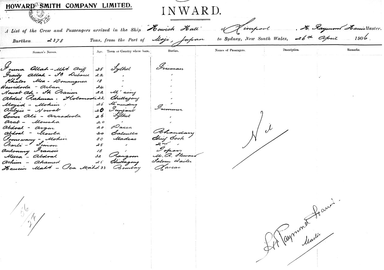 Mariners and ships in Australian Waters | HOWICK HALLOF LIVERPOOL, H. RAYMOND HARRIS, MASTER, BURTHEN 2378 TONS FROM THE PORT OF MOJI, JAPAN TO SYDNEY, NEW SOUTH WALES, 26TH APRIL, 1906 |