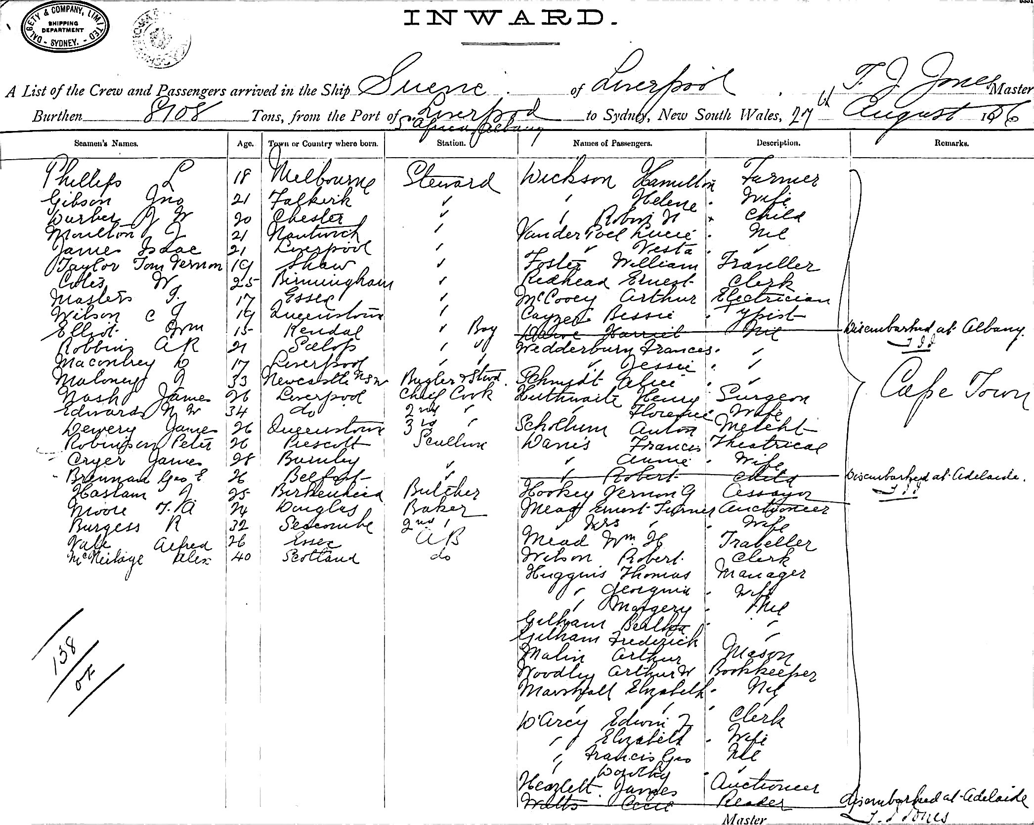 SUEVICOF LIVERPOOL, T. J. JONES, MASTER, BURTHEN 8108 TONS FROM THE PORT OF LIVERPOOL VIA SOUTH AFRICA, ALBANY & MELBOURNE TO SYDNEY, NEW SOUTH WALES, 27TH AUGUST 1906 |