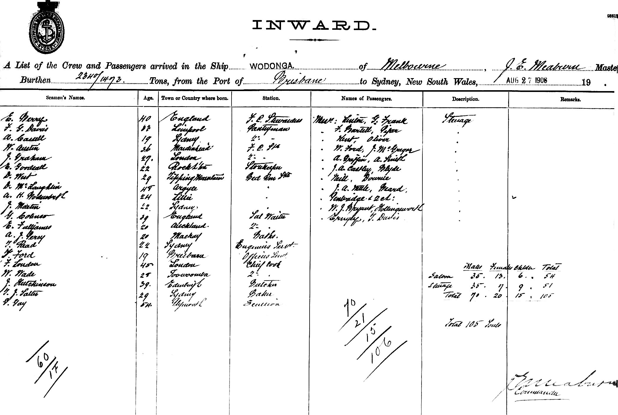 WODONGAOF MELBOURNE, J E. MEABURN, MASTER, BURTHEN 2340/1473 TONS FROM THE PORT OF BRISBANE & QUEENSLAND PORTS TO SYDNEY, NEW SOUTH WALES, 27TH AUGUST, 1906 |