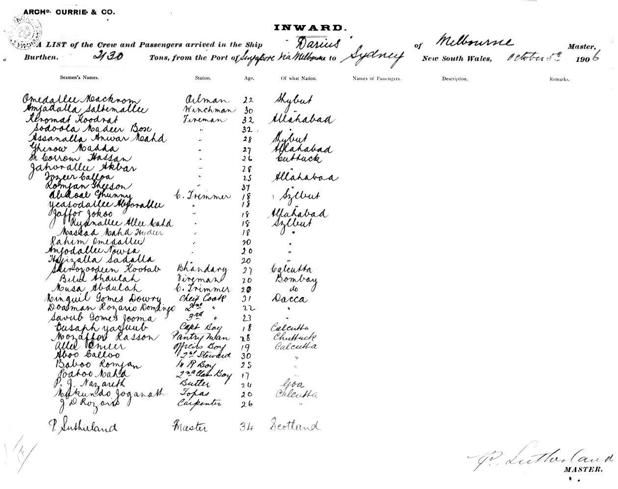 DARIUSOF MELBOURNE, P. SUTHERLAND, MASTER, BURTHEN 2130 TONS FROM THE PORTS OF JAVA & SINGAPORE VIA MELBOURNE TO SYDNEY, NEW SOUTH WALES, 5TH OCTOBER 1906 |