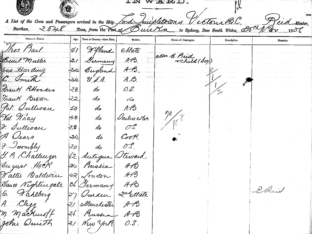 LORD TEMPLETOWNOF VICTORIA, B.C., E REID, MASTER, BURTHEN 2048 TONS FROM THE PORT OF EUREKA TO SYDNEY, NEW SOUTH WALES, 30TH NOVEMBER, 1906 |