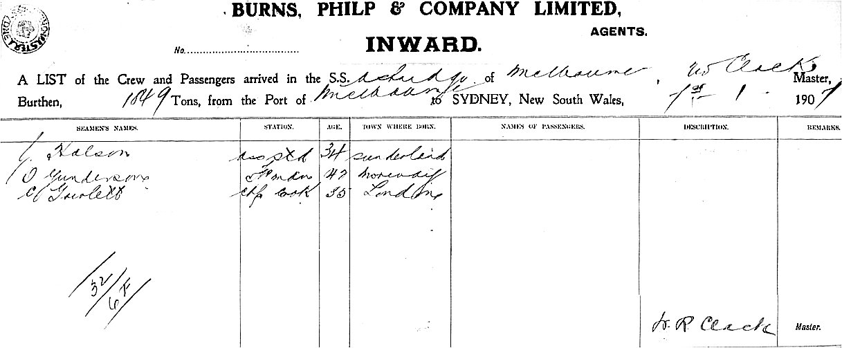 ASHRIDGEOF MELBOURNE, W. R. CLACK, MASTER, BURTHEN 1849 TONS FROM THE PORT OF MELBOURNE TO SYDNEY, NEW SOUTH WALES, 1ST JANUARY, 1907 |