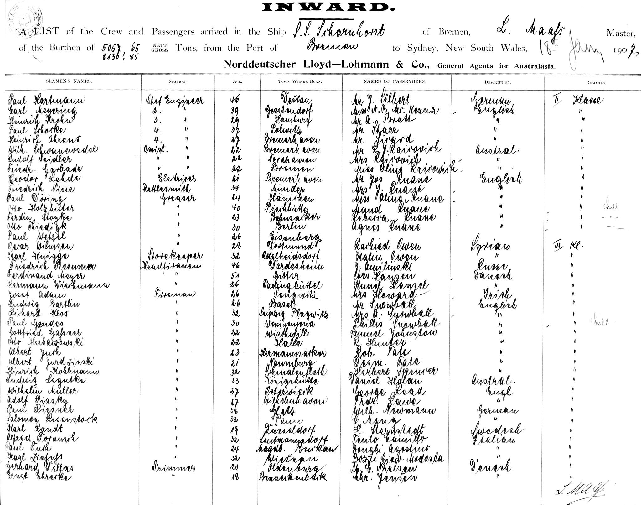 SCHARNHORSTOF BREMEN, L. MAASS, MASTER, BURTHEN 5053. 65/8430. 85 TONS FROM THE PORT OF BREMEN VIA MELBOURNE TO SYDNEY, NEW SOUTH WALES, 18TH JANUARY, 1907 |