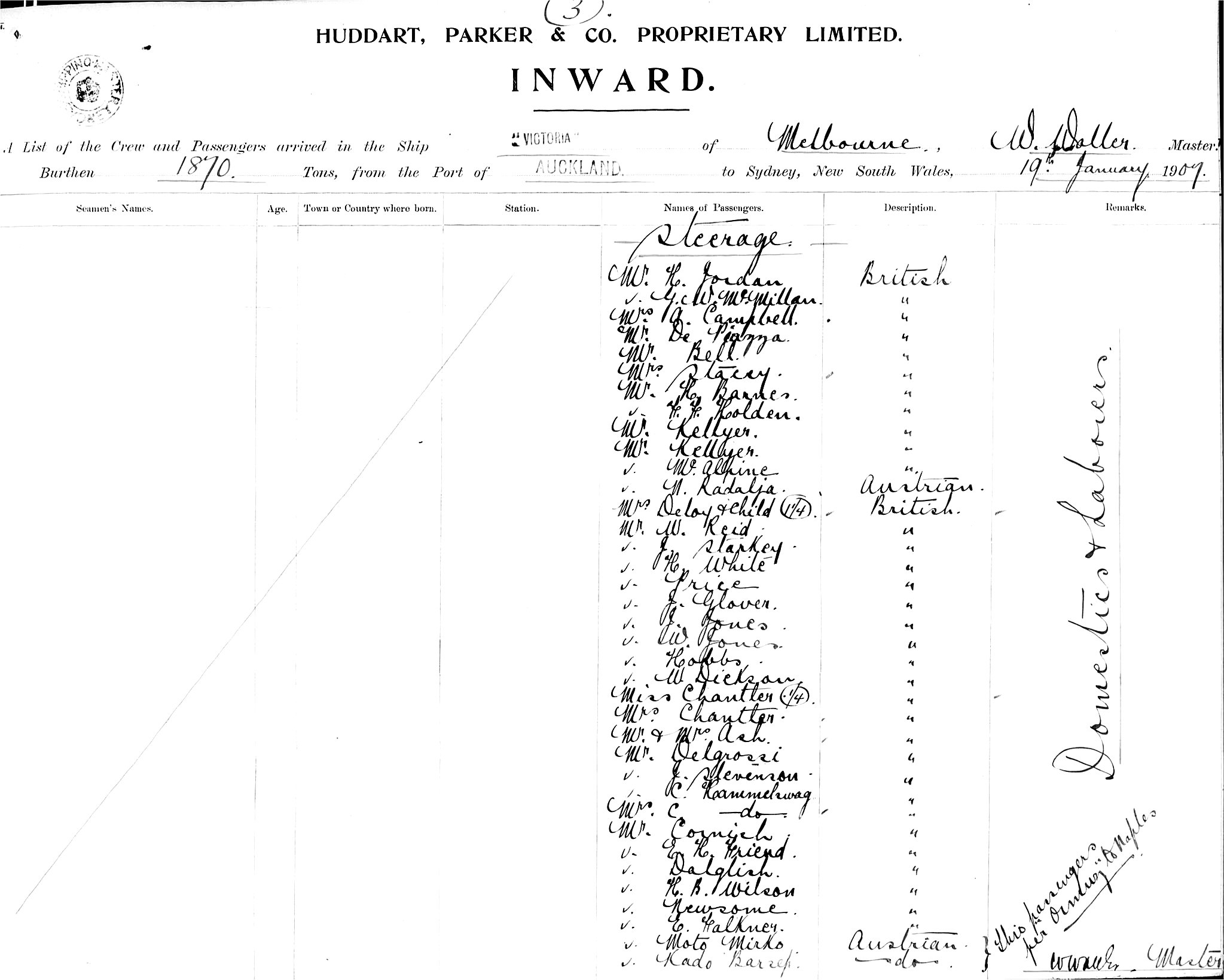 VICTORIAOF MELBOURNE, W. WALLER, MASTER, BURTHEN 1870 TONS FROM THE PORT OF AUCKLAND TO SYDNEY, NEW SOUTH WALES, 19TH JANUARY, 1907 |
