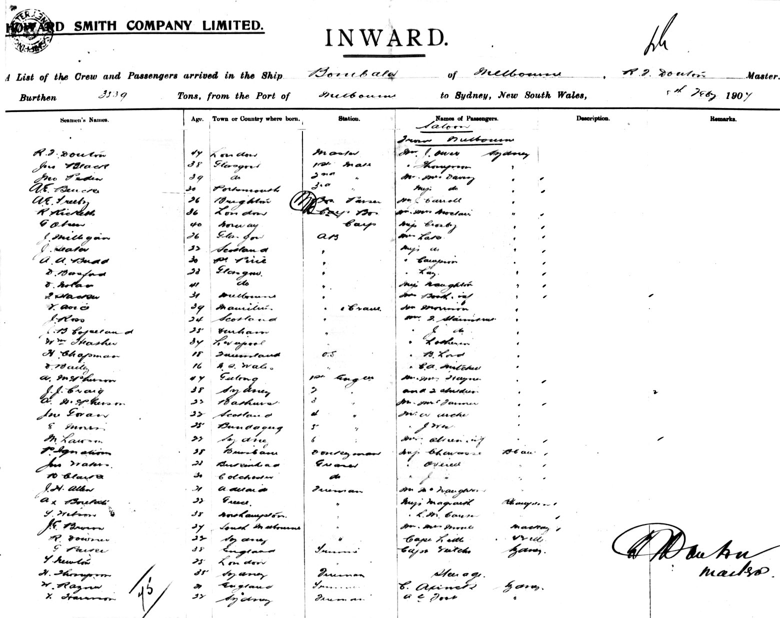BOMBALAOF MELBOURNE, R. F. DOUTON, MASTER, BURTHEN 3539 TONS FROM THE PORT OF MELBOURNE TO SYDNEY, NEW SOUTH WALES, 8TH FEBRUARY, 1907 |