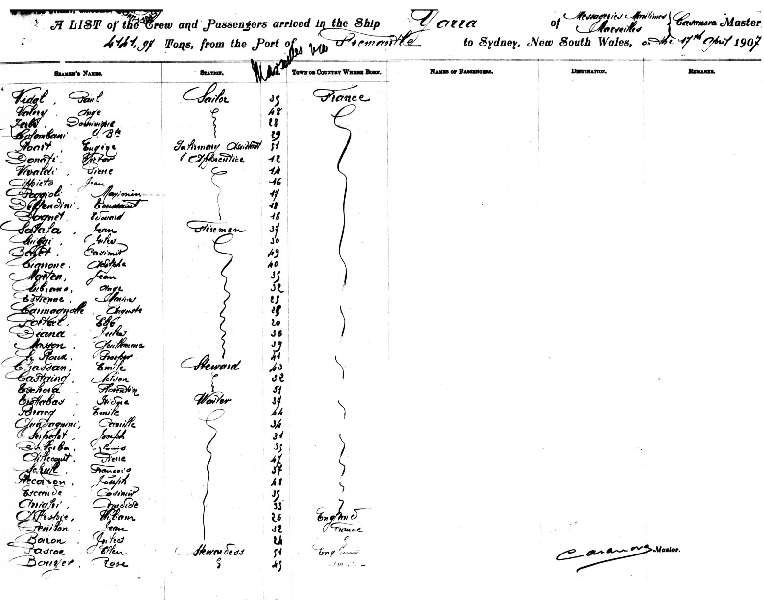 YARRAOF MARSEILLES, E. CASANOVA, MASTER, BURTHEN 4141. 97 TONS FROM THE PORT OF MARSEILLES VIA FREMANTLE & MELBOURNE TO SYDNEY, NEW SOUTH WALES, 17 APRIL 1907 |