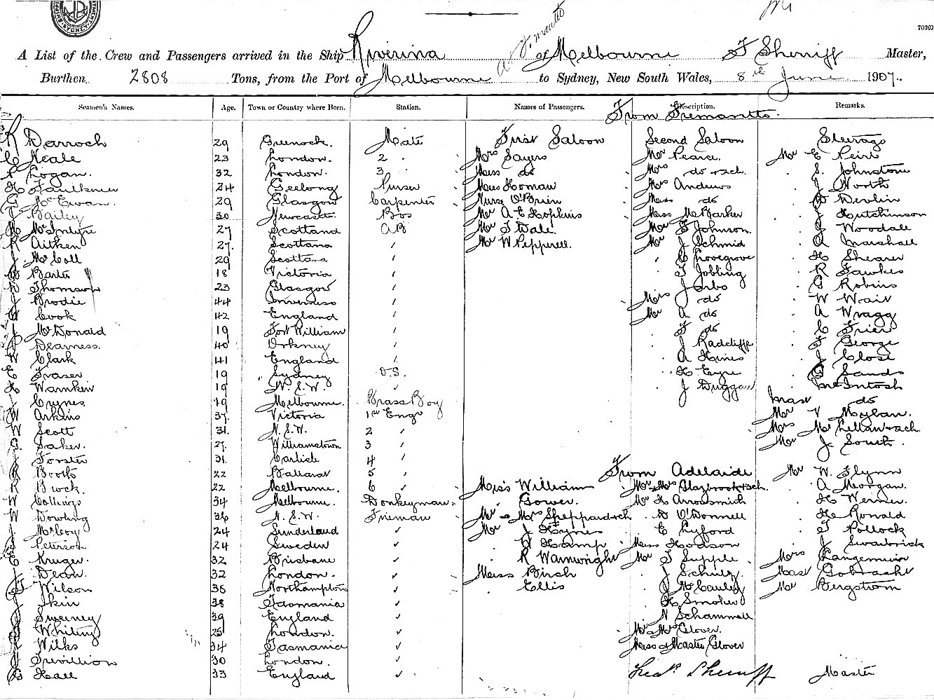 RIVERINAOF MELBOURNE, F. SHERRIFF, MASTER, BURTHEN 2808 TONS FROM THE PORT OF MELBOURNE VIA FREMANTLE TO SYDNEY, NEW SOUTH WALES, 8TH JUNE 1907