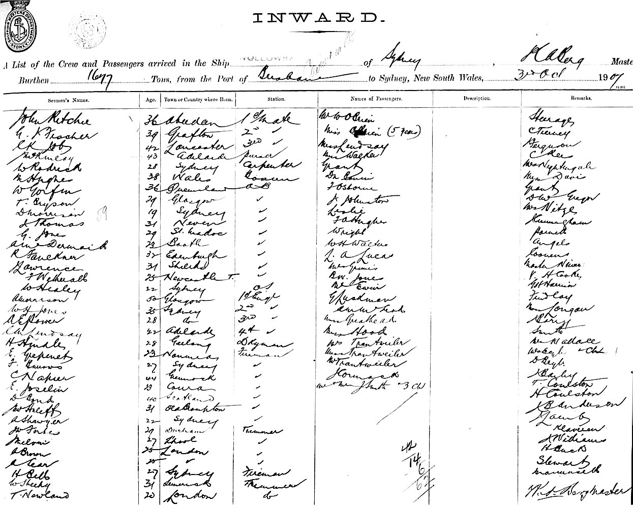 WOLLOWRAOF SYDNEY, K A BERG, MASTER, BURTHEN 1677 TONS FROM THE PORT OF CAIRNS via BRISBANE TO SYDNEY, NEW SOUTH WALES, 3RD OCTOBER, 1907 |
