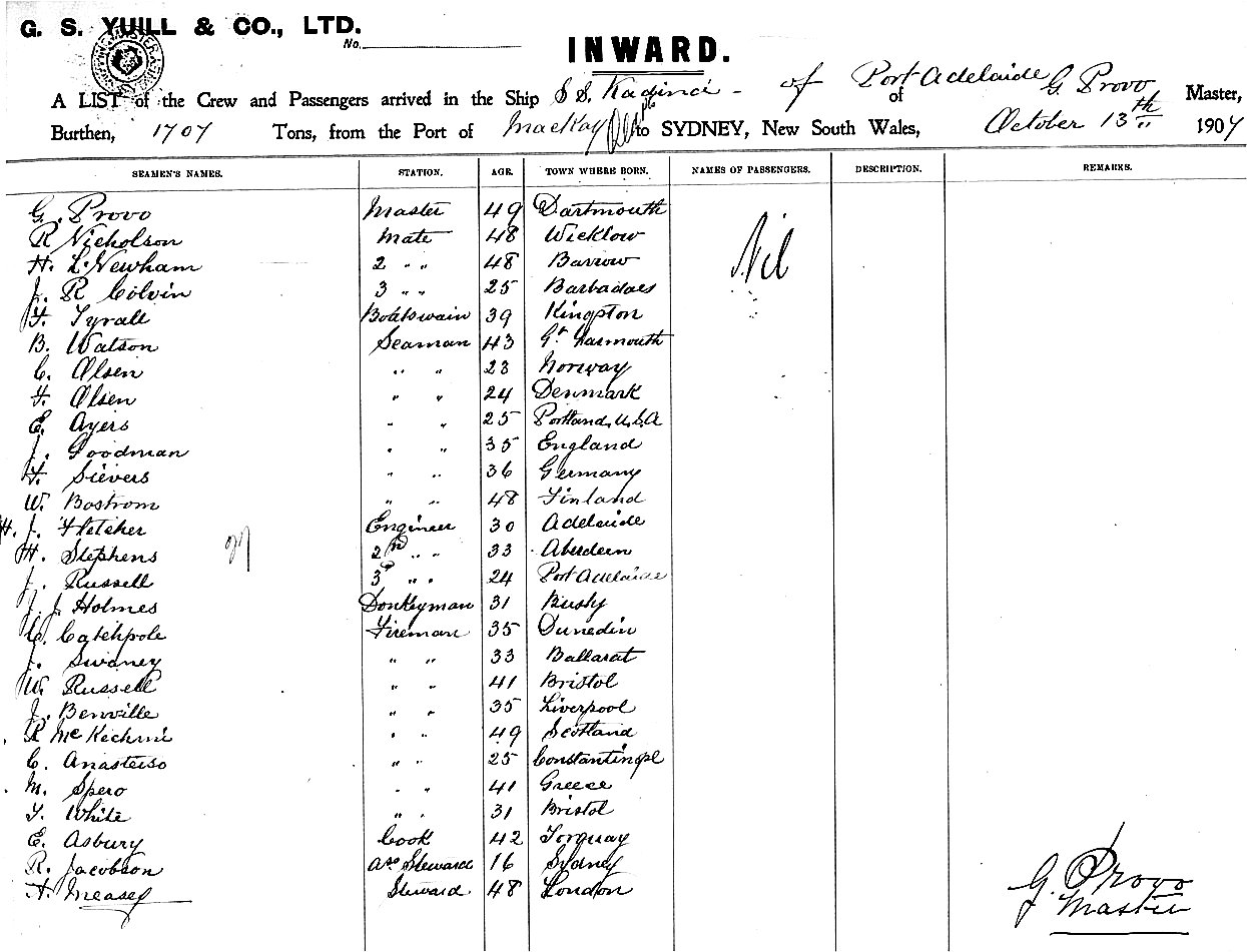 KADINAOF PORT ADELAIDE G. PROVO, MASTER, BURTHEN 1707 TONS FROM THE PORT OF MACKAY & QUEENSLAND PORTS TO SYDNEY, NEW SOUTH WALES, 13THOCTOBER 1907 |