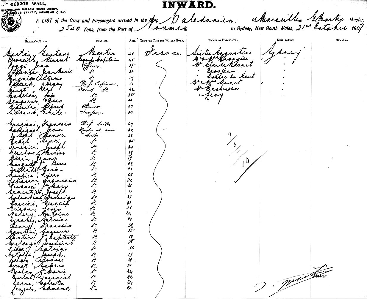 CALEDONIENOF MARSEILLES, G. MARTIN, MASTER, BURTHEN 2540 TONS FROM THE PORT OF NOUMEA TO SYDNEY, NEW SOUTH WALES, 21ST OCTOBER 1907 |