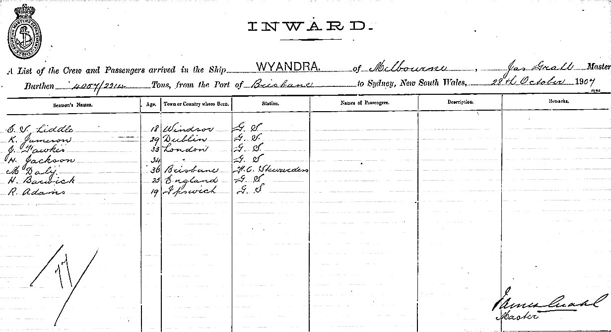 WYANDRAOF MELBOURNE, JAS GRAHL, MASTER, BURTHEN 4057/2214 TONS FROM THE PORT OF BRISBANE & QUEENSLAND PORTS TO SYDNEY, NEW SOUTH WALES, 28th OCTOBER 1907 |