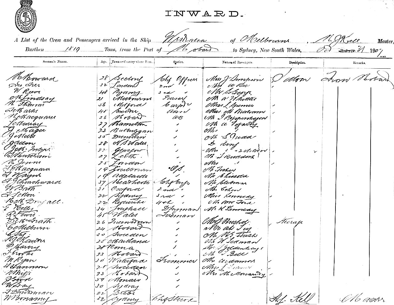 WESTRALIAOF MELBOURNE, H.J. KELL, MASTER, BURTHEN 1819 TONS FROM THE PORT OF HOBART TO SYDNEY, NEW SOUTH WALES, 31ST OCTOBER 1907 |