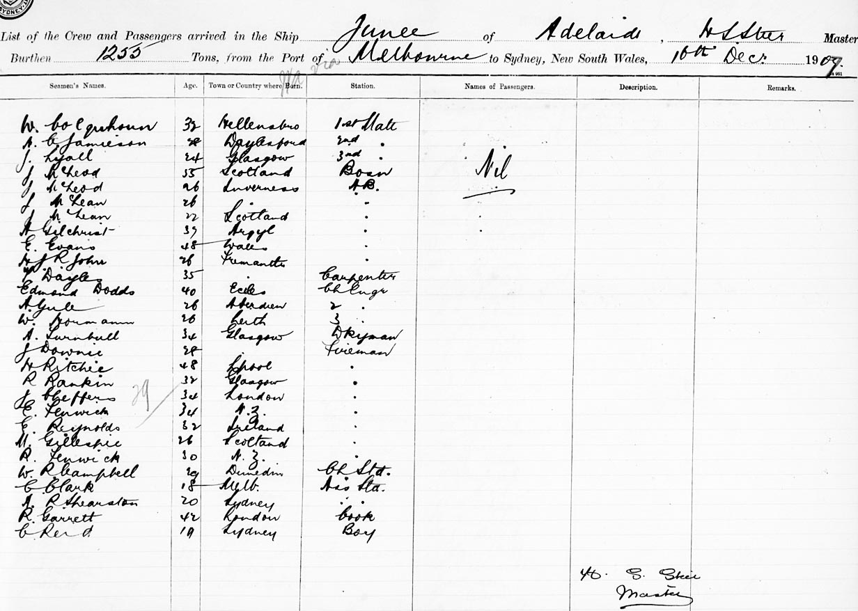 JUNEEOF ADELAIDE, H. S. STEER, MASTER, BURTHEN 1255 TONS FROM THE PORT OF MELBOURNE TO SYDNEY, NEW SOUTH WALES, 16TH DECEMBER 1907 |