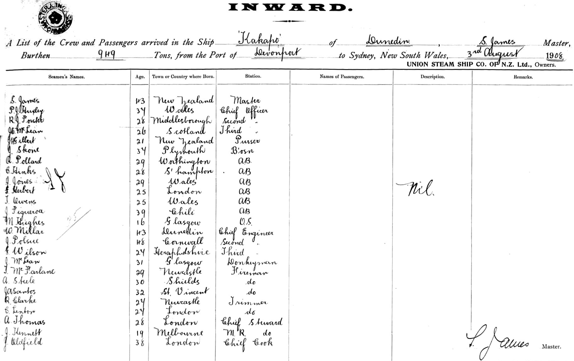 KAKAPOOF DUNEDIN, S. JAMES MASTER, BURTHEN 949 TONS FROM THE PORT OF DEVONPORT TO SYDNEY, NEW SOUTH WALES, 3RD AUGUST 1908 |