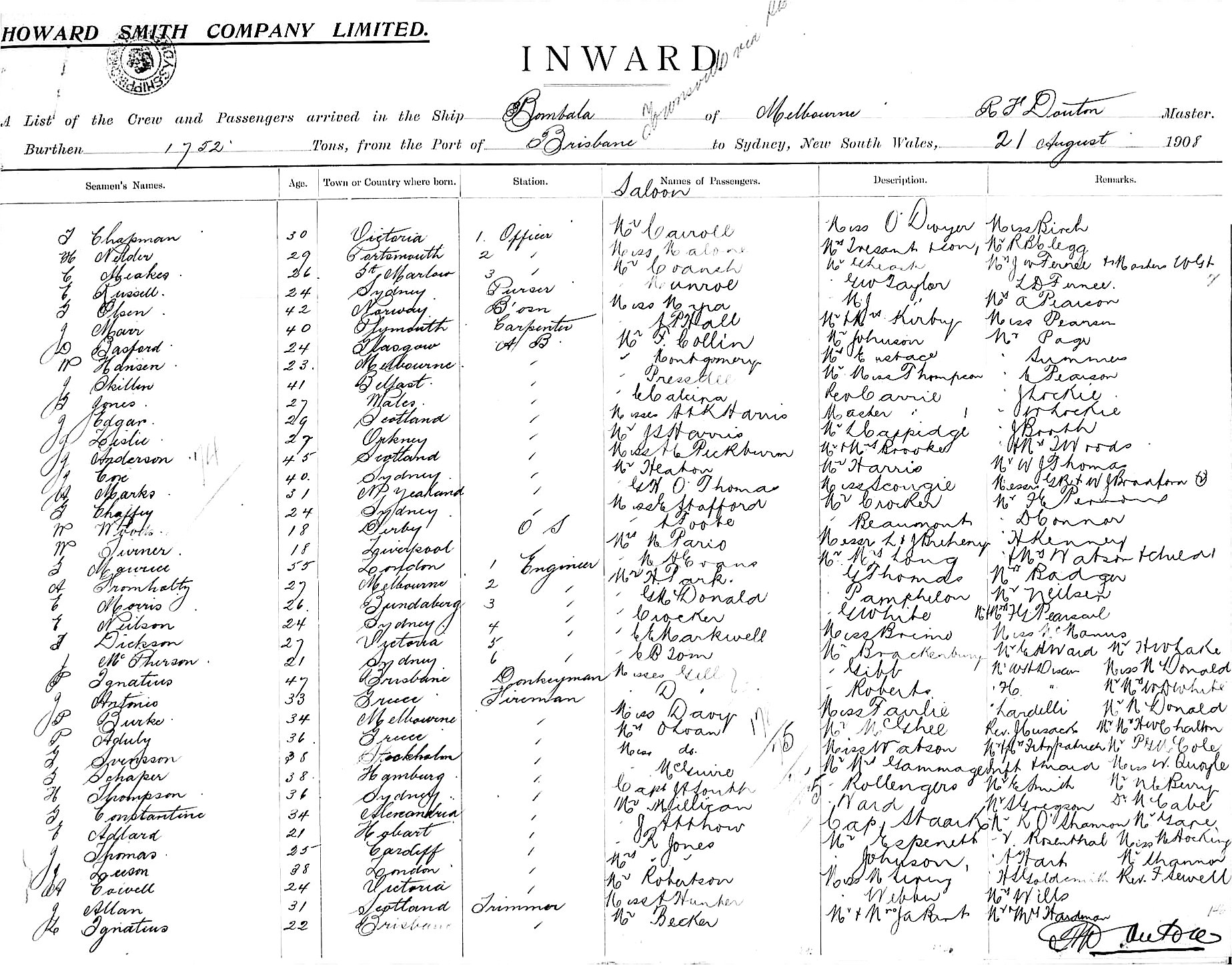 BOMBALAOF MELBOURNE, R. F. DOUTON, MASTER, BURTHEN 1752 TONS FROM THE PORTS OF TOWNSVILLE via BRISBANE TO SYDNEY, NEW SOUTH WALES, 20TH AUGUST 1908 |