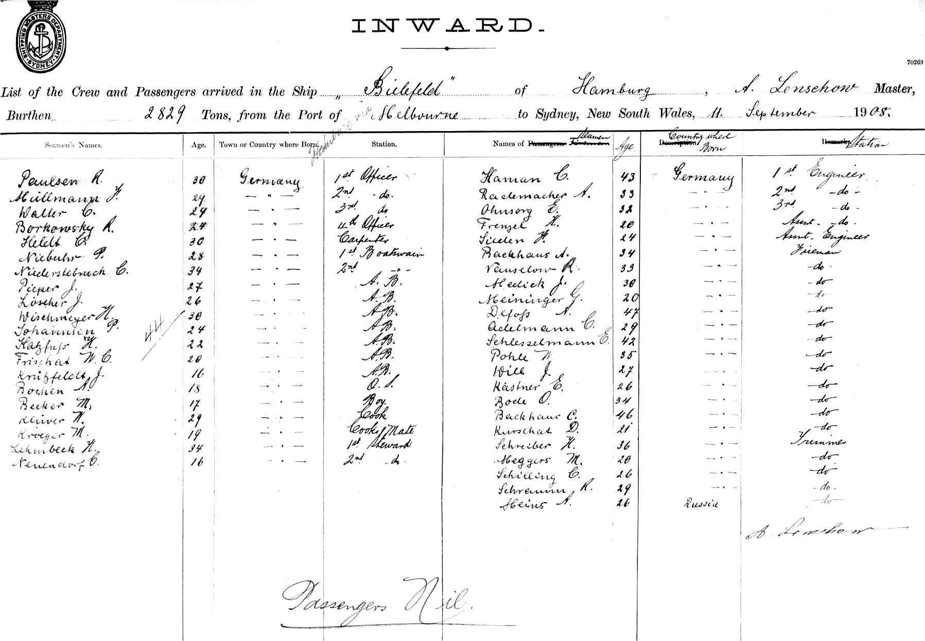 BIELEFELDOF HAMBURG, A. LENSCHOW MSTER, BURTHEN 2829 TONS FROM THE PORT OF HAMBURG VIA MELBOURNE TO SYDNEY NEW SOUTH WALES, 11TH SEPTEMBER, 1908 |