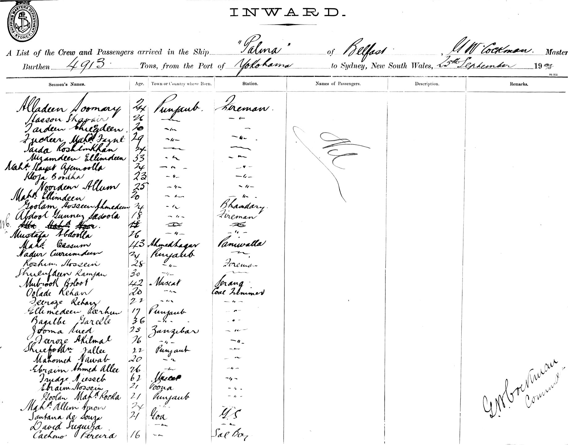 PALMAOF BELFAST, G. W. COCKMAN, MASTER,BURTHEN 4913 TONS FROM THE PORT OF YOKOHAMA VIA BRISBANE TO SYDNEY NEW SOUTH WALES, 25TH SEPTEMBER, 1908 |
